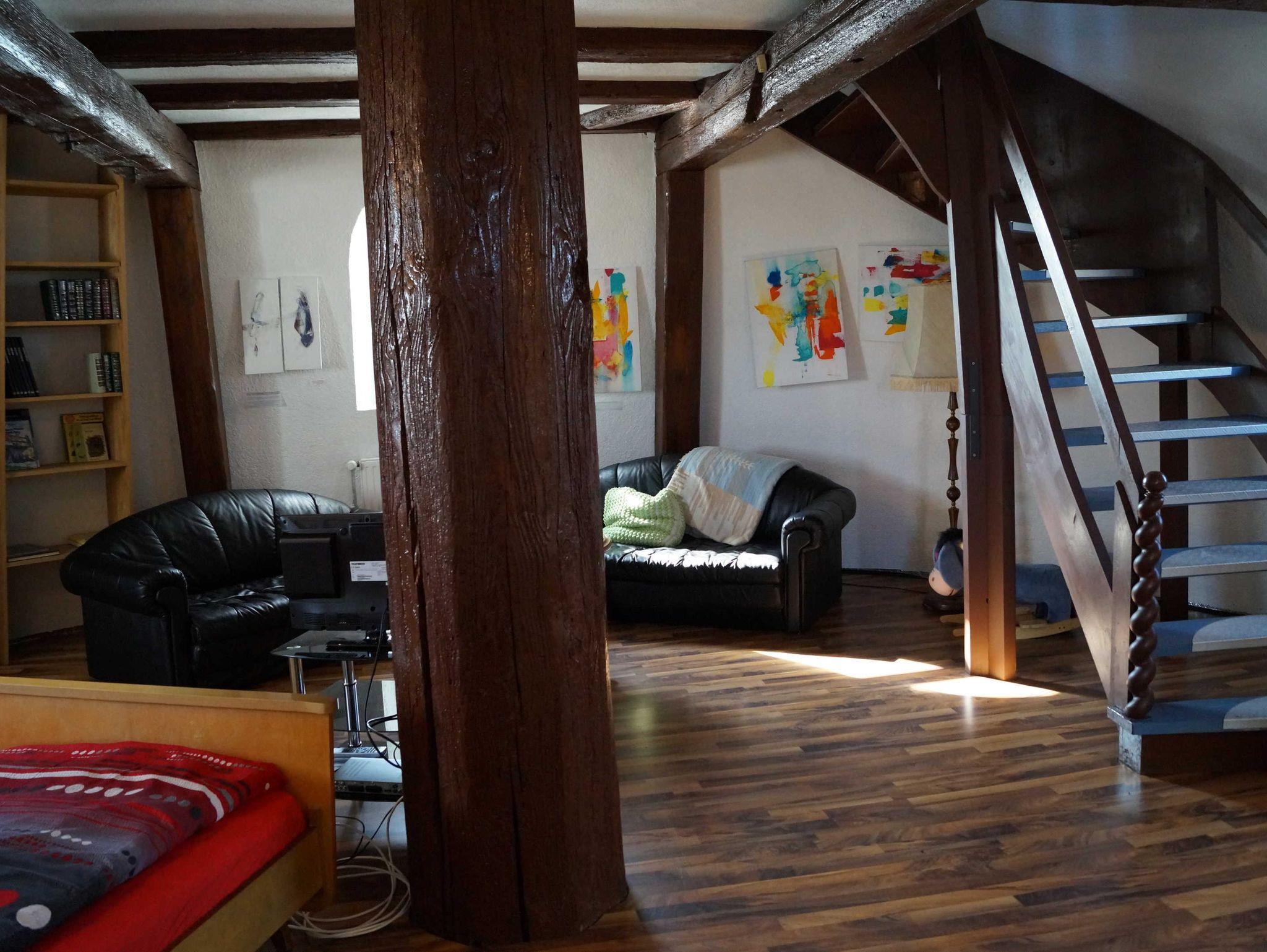 1. OG: ca. 45 m2; Schlafzimmer mit Doppelbett und Schalfsofa (für 2 Personen) mit offener Treppe in das 2. OG