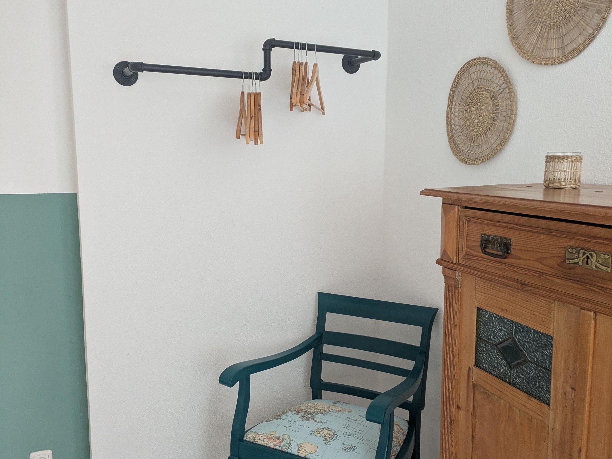 Wohnzimmer und Küche bilden einen offenen, sehr hellen Wohnbereich, der durch ein weiteres altes Vertiko charmant ergänzt wird. Die Küche ist gut ausgestattet und der gesamte Bereich gemütlich eingerichtet, sodass man sich sofort wohlfühlt. Ein zusätzlicher Abstellraum bietet praktischen Stauraum für ihre Koffer. Staubsauger, Besen und andere Utensiliensind hier gut verstaut und sorgt gleichzeitig für Ordnung.