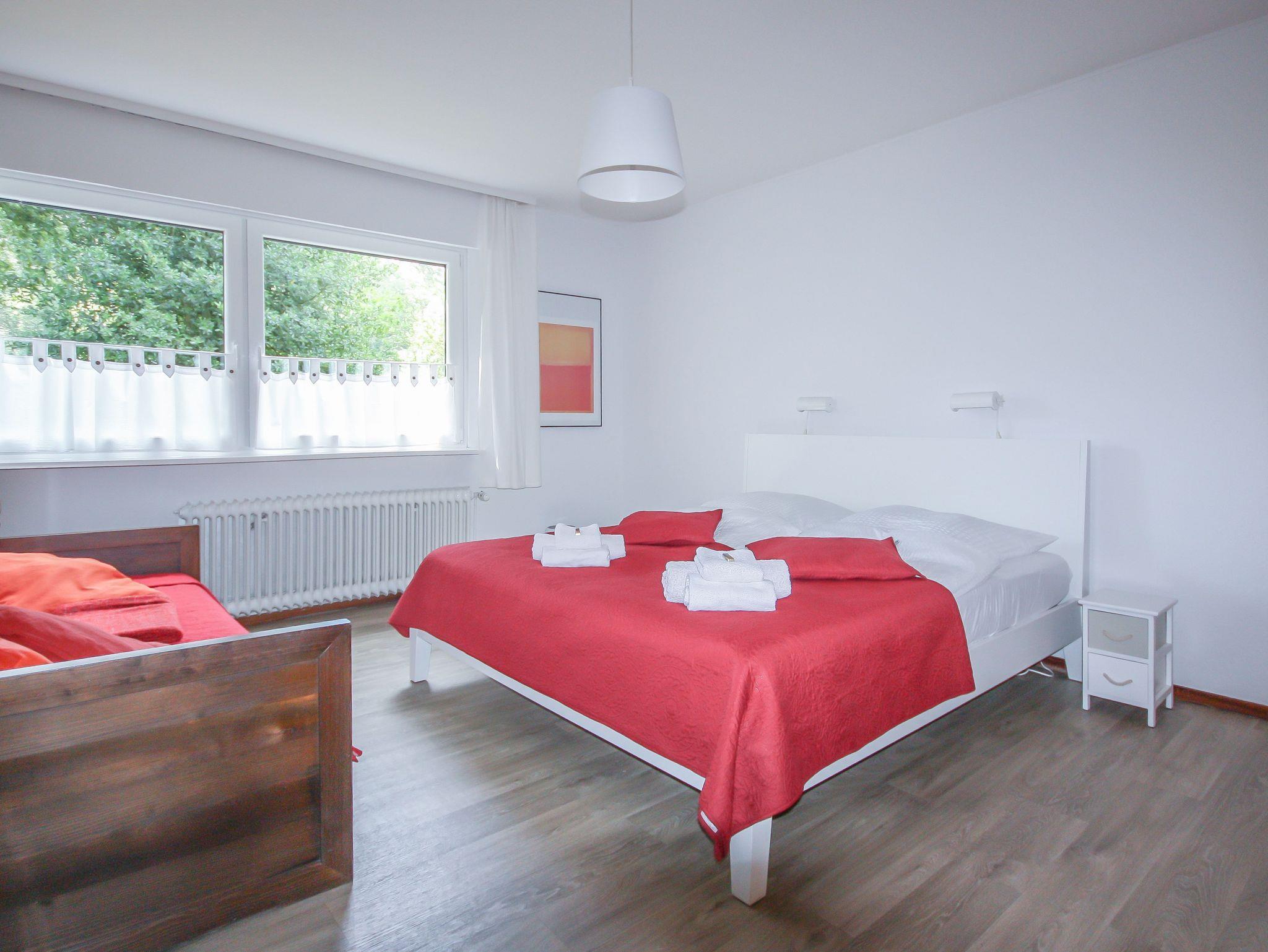 Das geräumige Schlafzimmer verfügt über ein großes Doppelbett ( 180 x 200 cm) sowie einem weiteren Einzelbett. ein großzügiger Kleiderschrank bietet ausreichend Platz. Bereits aus diesem Zimmer haben Sie einen traumhaften Blick über die angrenzende Marcusheide.
