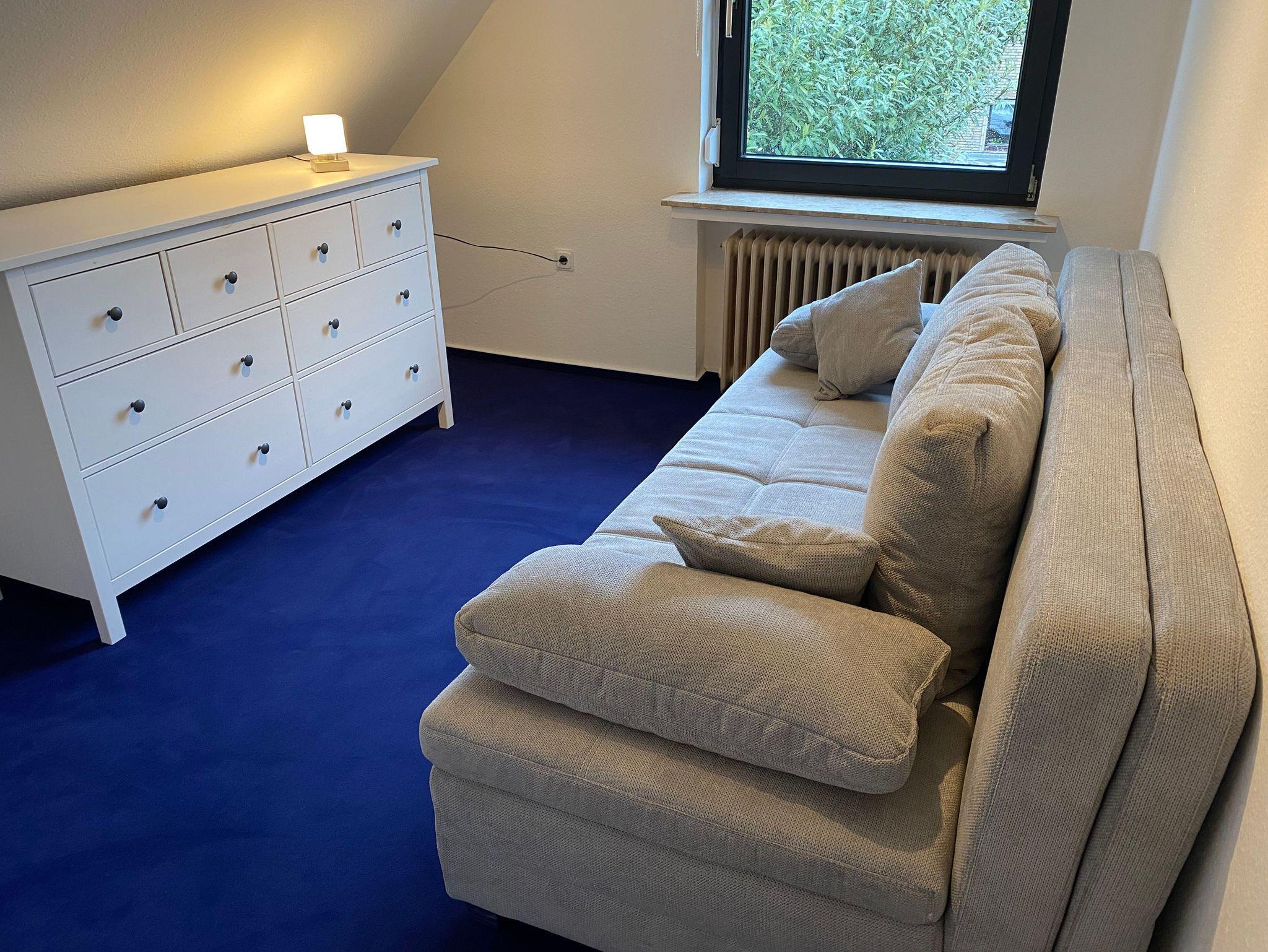 Sie wohnen in einer renovierten gemütlichen Wohnung im Obergeschoss eines Einfamilienhauses. Sie haben ein Wohnzimmer ein Schlafzimmer mit Doppelbett, ein großes Bad mit Dusche und Eckbadewanne, eine separate Küche mit Waschmaschine, Trockner und verfügen über die komplette Küchenausstattung mit einem Kaffee Vollautomaten von DeLonghi, so wie ein zweites Schlafzimmer mit einer Schlafcouch. Das Haus befindet sich schräg gegenüber dem Kunstcentrum Alte Molkerei.