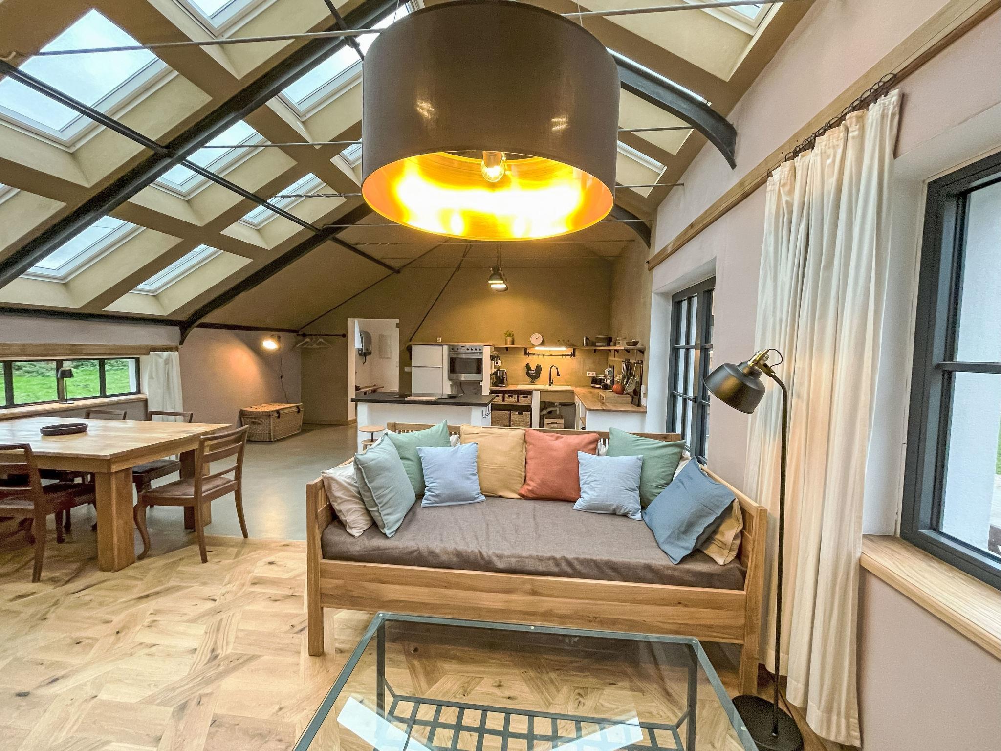 "Tiny House de luxe", 1-room chalet 65 m2, on the ground floor. Bright, partly with sloping ceilings, fully renovated in 2024, very stylish and cosy furnishings: open living/sleeping room with 1 sofabed (100 cm, length 200 cm), 1 double sofabed (180 cm, length 200 cm), Scandinavian wood stove. Exit to the terrace. Open kitchen (oven, dishwasher, 4 ceramic glass hob hotplates, kettle, electric coffee machine) with dining table and kitchen corner. Shower/WC. Parquet floors, natural stone floors. Large terrace 20 m2. Terrace furniture. Beautiful view of the garden. Facilities: washing machine. Parking (1 car) at the house. Please note: non-smoking house. The furniture and window sills are made from our own wood from the adjacent forest. The walls are made of sand-lime brick. Bookings accepted for holiday purposes only.