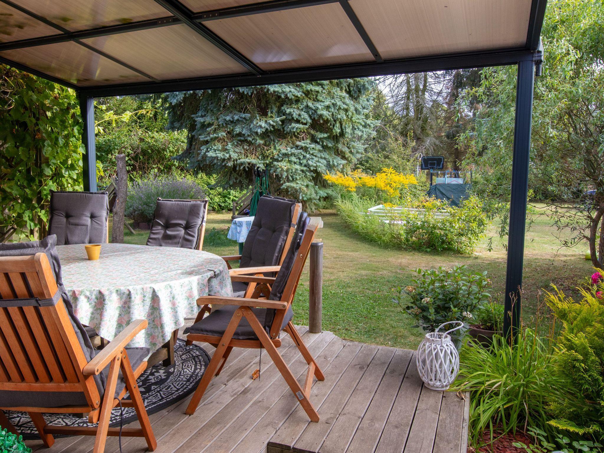 Weiterhin befinden sich im Garten Gartenstühle und Tisch, zwei Sonnenliegen, eine Grillmöglichkeit sowie ein Kinderspielplatz mit Trampolin.