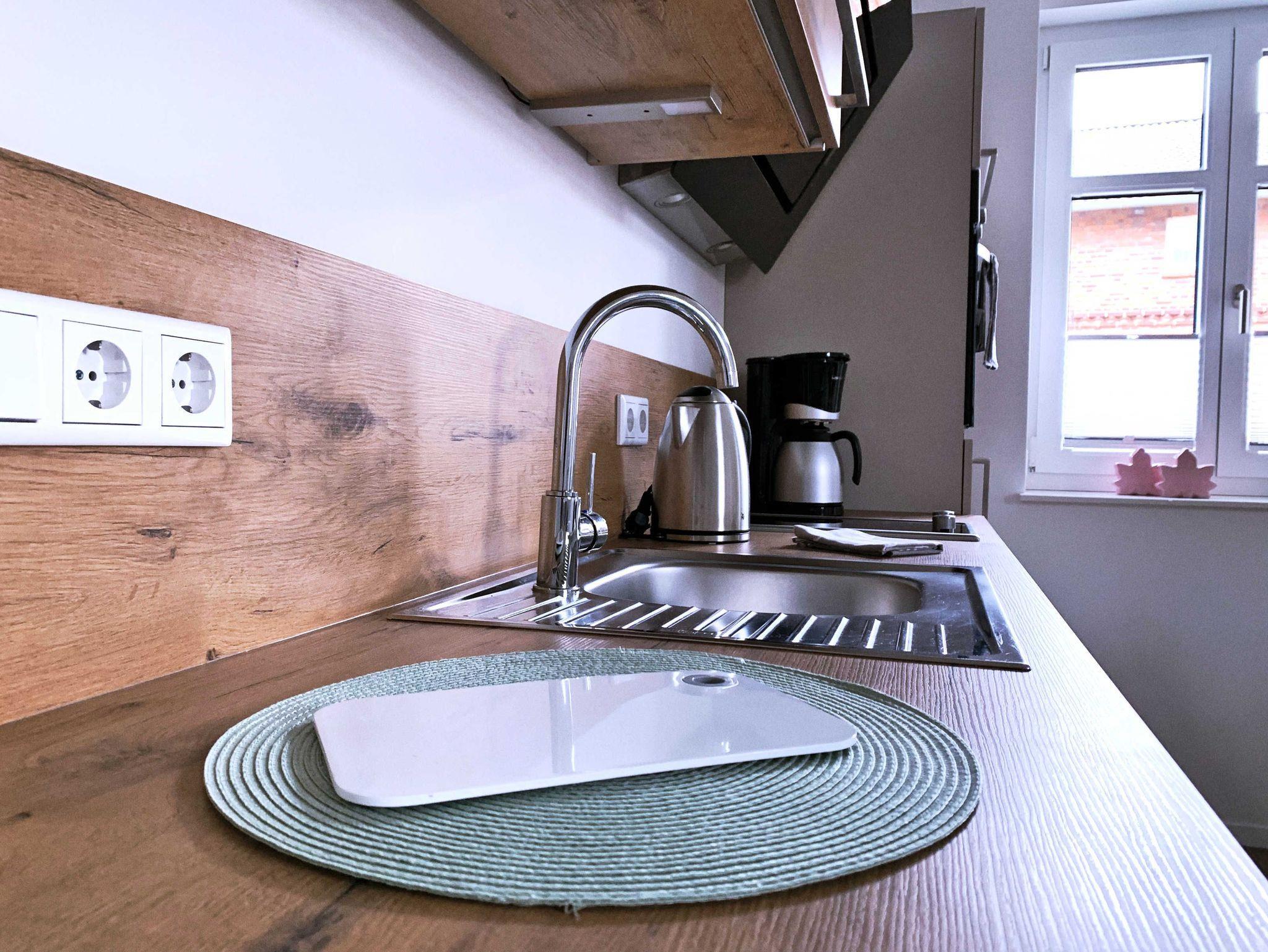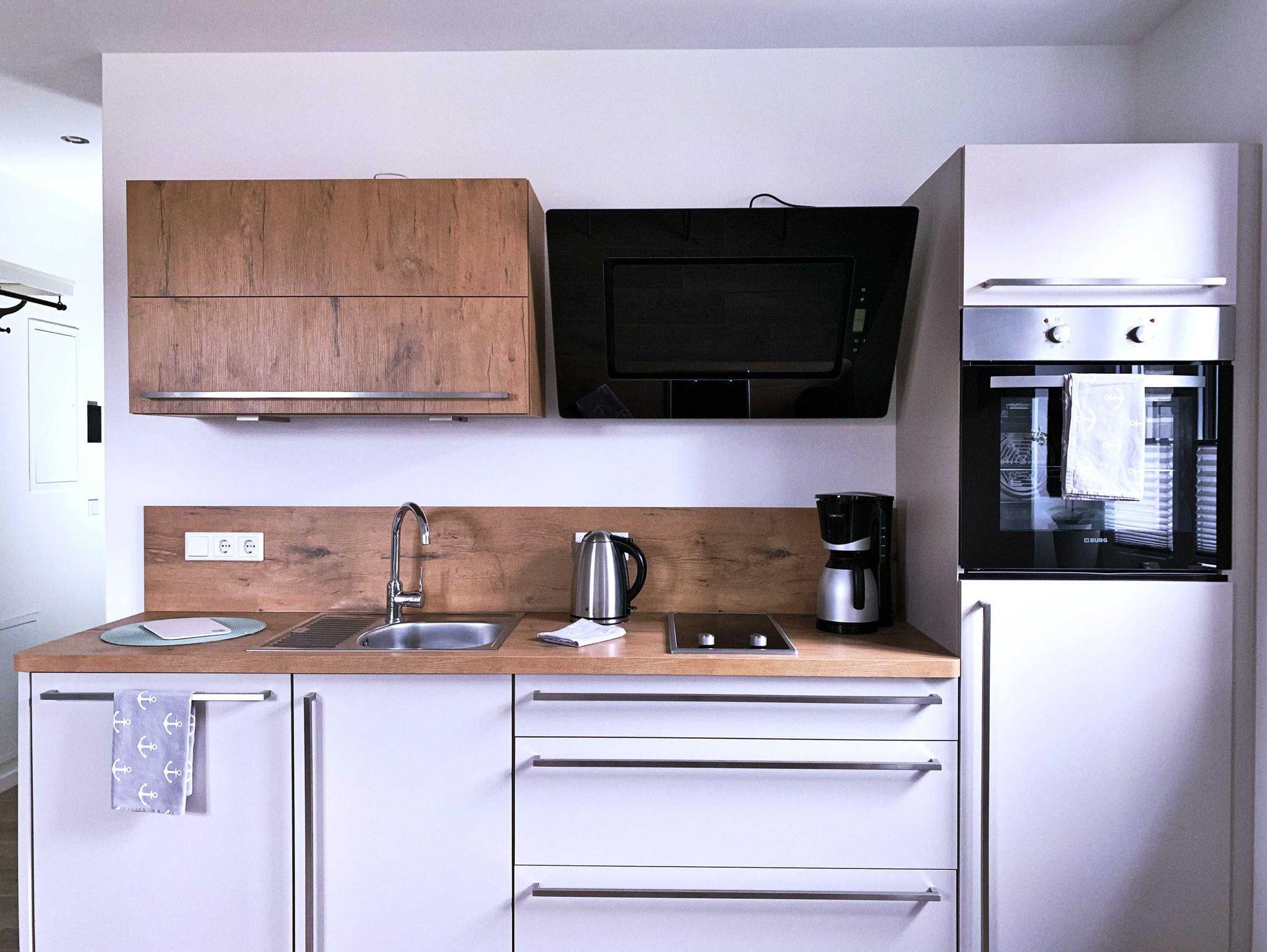 Die offene Wohnküche wurde mit SAT-TV, kostenlosem WLAN-Gastzugang, einer Küchenzeile und einer Schlafcouch ausgestattet.