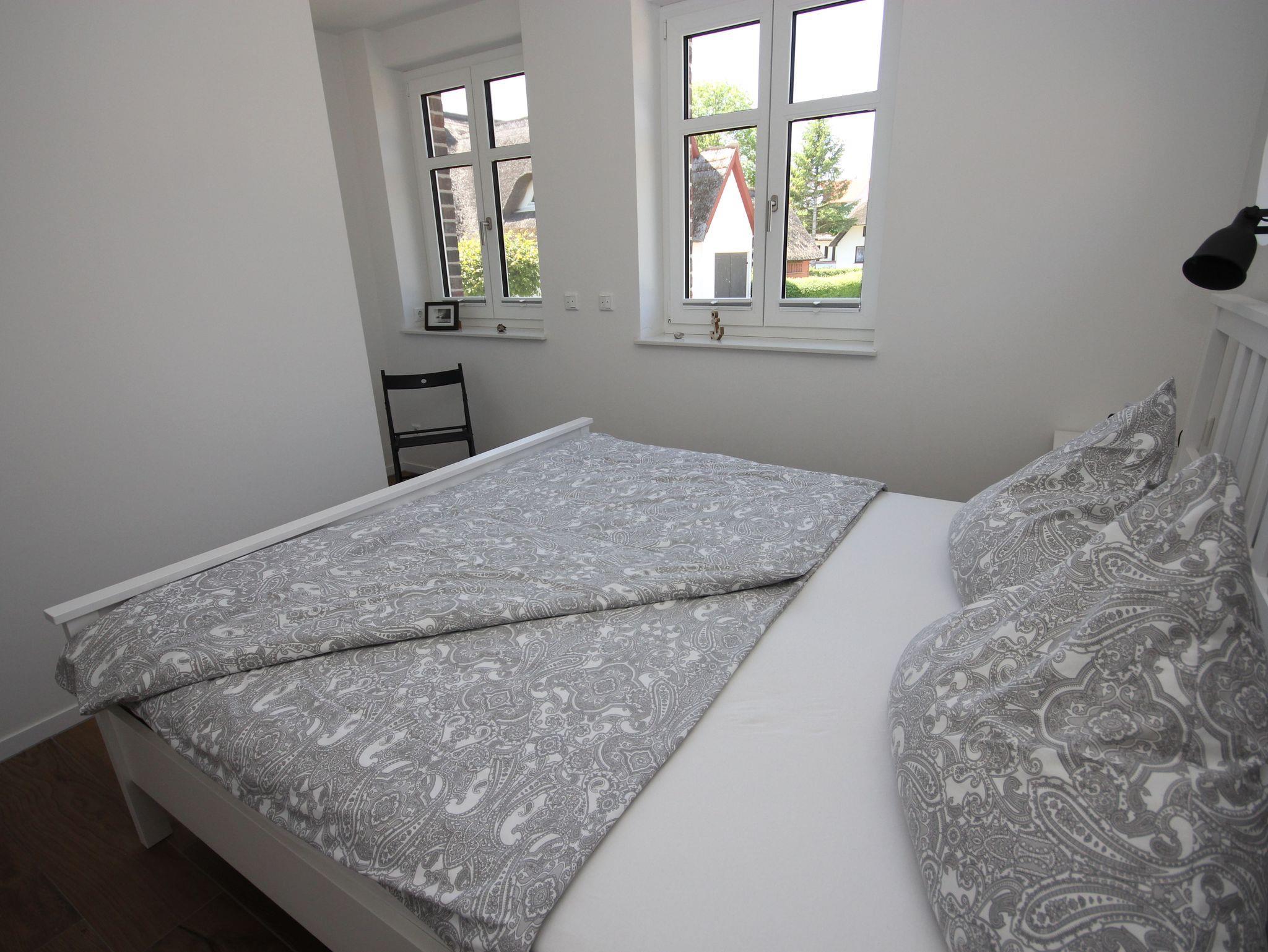 Der Schlafraum besitzt ein Doppelbett (1,80 x 2,00 m) mit getrennten Matratzen und einem Topper sowie einem Kleiderschrank mit genügend Stauraum. Bei Bedarf kann dort ein Kinderreisebett aufgestellt werden.