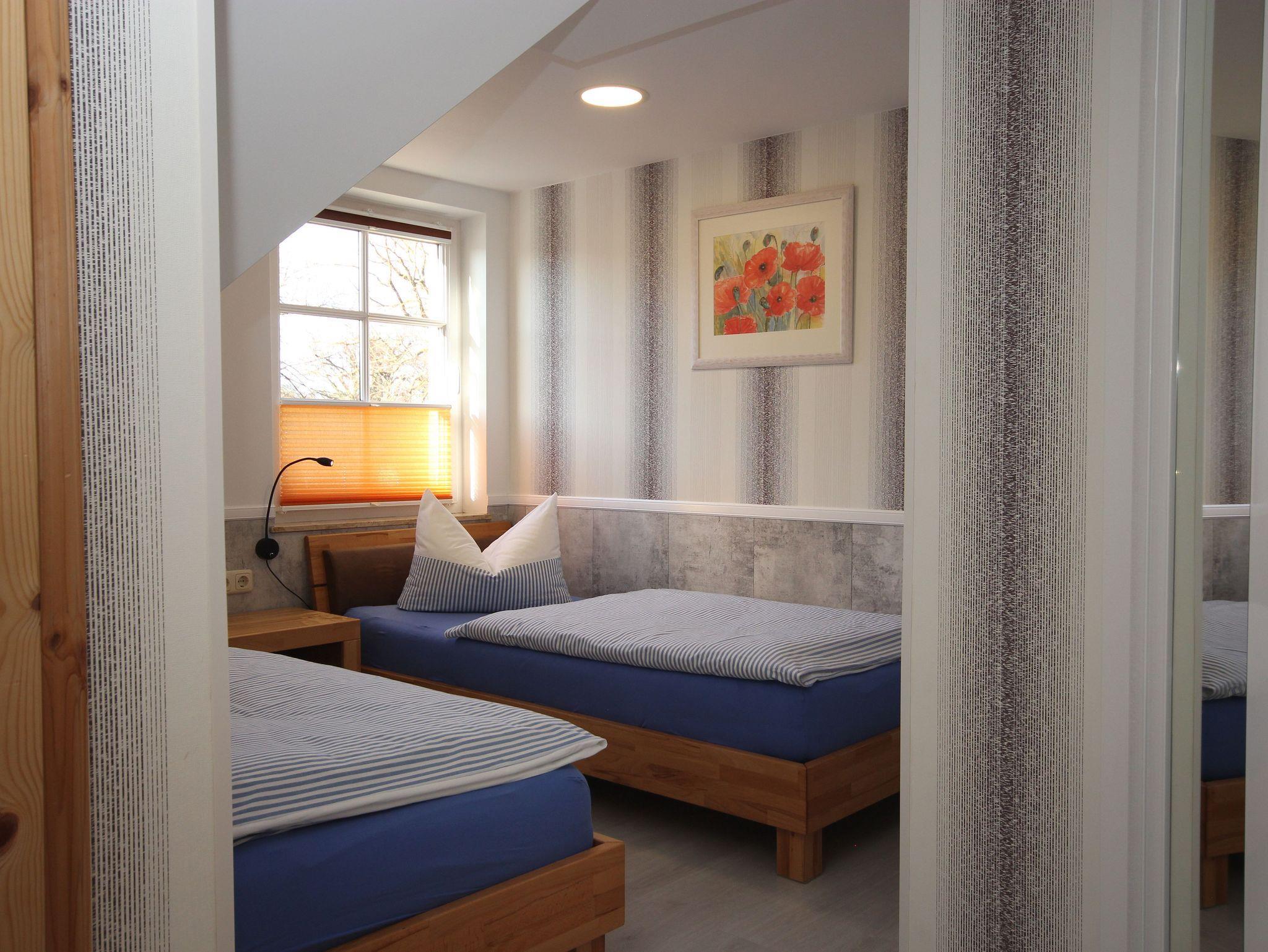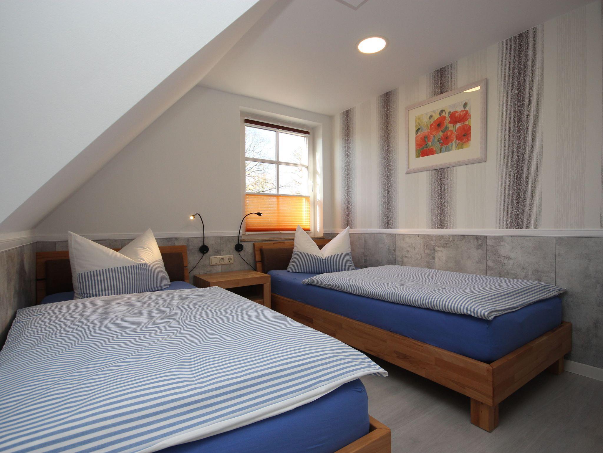 die lichtdurchflutete Wohnung mit separatem Eingang liegt im Obergeschoss mit Balkon (Süd- West- Ausrichtung) . Der Balkon ist überdacht und lädt bei jedem Wetter zum gemeinsamen Beisammensein ein. Die Ferienwohnung liegt in einer sehr ruhiger Lage und der feinsandige Strand ist nur wenige Minuten entfernt.Das Wohnzimmer ist mit einer gemütlichen Couch, SAT- TVund Radio. Für unsere Gäste ist das WLAN kostenlos. Im 1. Schlafzimmer befindet sich ein Doppelbett ( 1,80 x 2,00 m) und getrennten Matratzen und ein großer Kleiderschrank mit viel Stauraum. Das 2. Schlafzimmer verfügt über 2 Einzelbetten 0,90 x 2,00 cm. Die offene Küchenzeile mit Ihrer komfortablen Ausstattung, wie Geschirrspüler, Mikrowelle, 4- Platten- Cerankochfeld, Kaffeemaschine, Toaster , Wasserkocher und einem Essplatz lädt unsere Gäste zum gemeinsamen kochen ein.Die Wohnung wird mit Bettwäsche und Handtücher (jeweils pro Person 1 Badehandtuch und ein kleines Handtuch) übergeben.Das großzügige Bad ist mit einer Dusche ausgestattet. Ein Fahrradcarport nicht verschließbar kann auf dem Grundstück genutzt werden. Unsere Wohnungen sind Nichtraucherwohnungen. Die Ferienwohnung ist nicht für Kinder unter 5 Jahren geeignet.