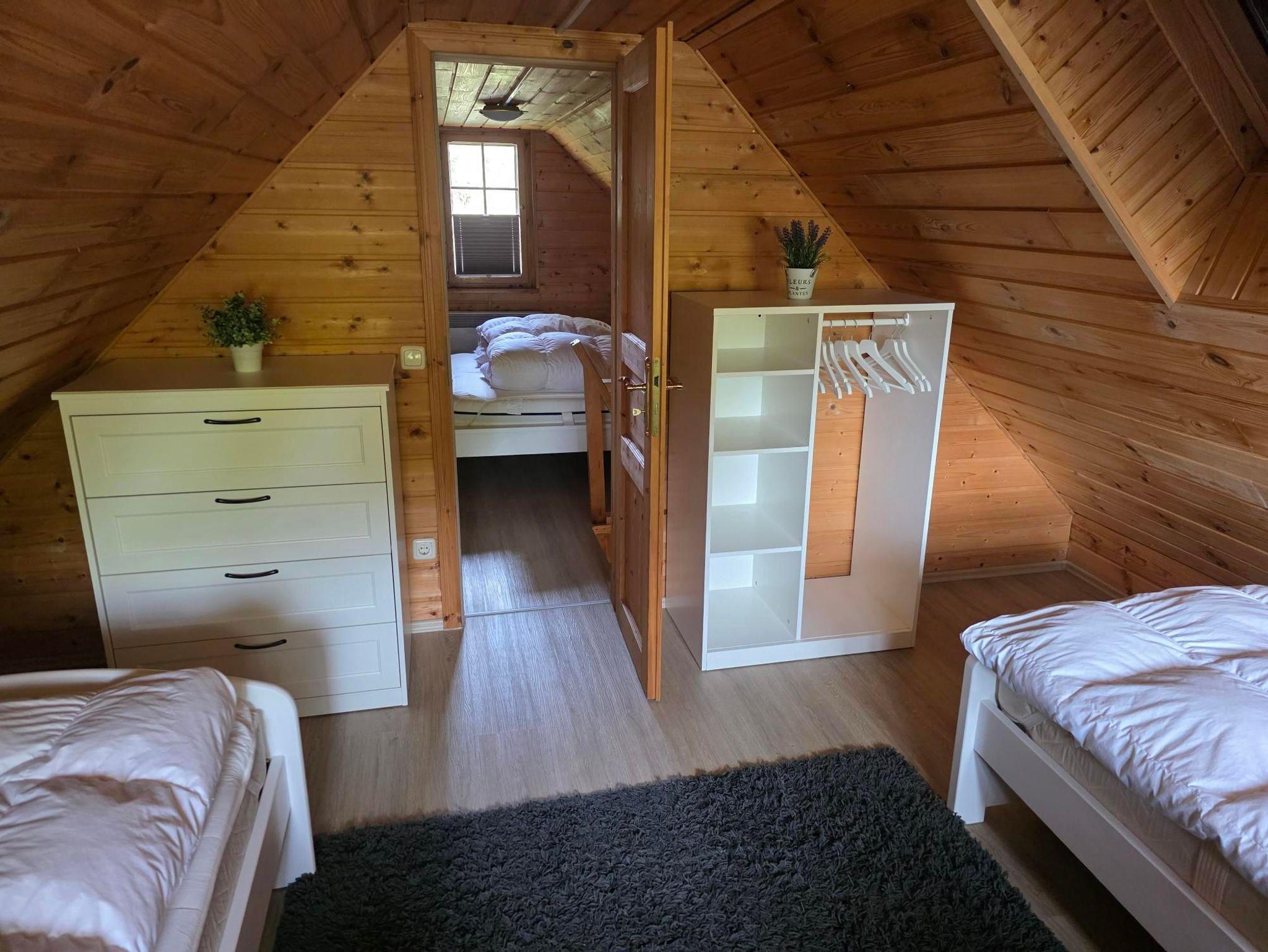Das modern eingerichtete 70 qm große freistehende Holzblockhaus mit seinem großzügigen Garten eignet sich sowohl für die Zweisamkeit, als auch für Familien. Die gemütliche Wohnfläche erstreckt sich über 2 Etagen. Im Erdgeschoß befindet sich der Wohnraum, eine offene Küche mit Esstisch und das Bad mit Dusche/WC. Der Wohnbereich ist mit einem TV, Kamin und einer gemütlichen Couch ausgestattet. Im Obergeschoß befinden sich die beiden Schlafräume und der Wintergarten mit Blick ins Grüne. Der erste Schlafraum enthält ein Doppelbett mit 160 cm Breite, der Zweite zwei Einzelbetten mit jeweils 90 cm Breite. Die Terrasse ist mit Sonnenmarkise, Gartenmöbeln und Grill ausgestattet. Fahrradabstellmöglichkeiten sind im Nebengelass vorhanden und ein Parkplatz befindet sich direkt vor dem Grundstück. Für die kleinen Gäste steht ein Sandkasten zur Verfügung. Mehrere Badestellen befinden sich im Umkreis von 300 Metern.