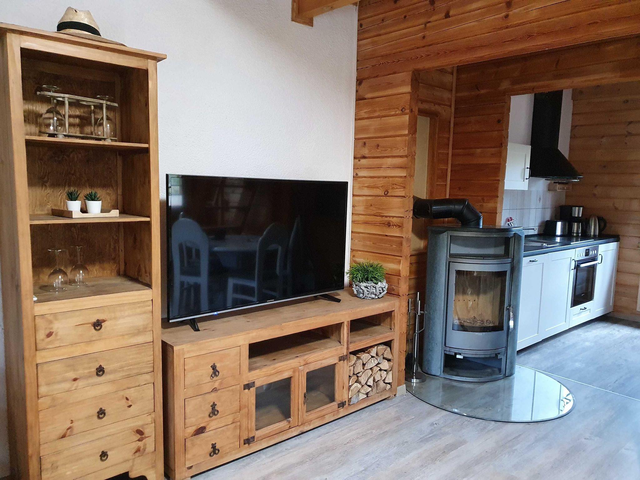mit Dusche/WC. Der Wohnbereich ist mit einem TV, Kamin und einer