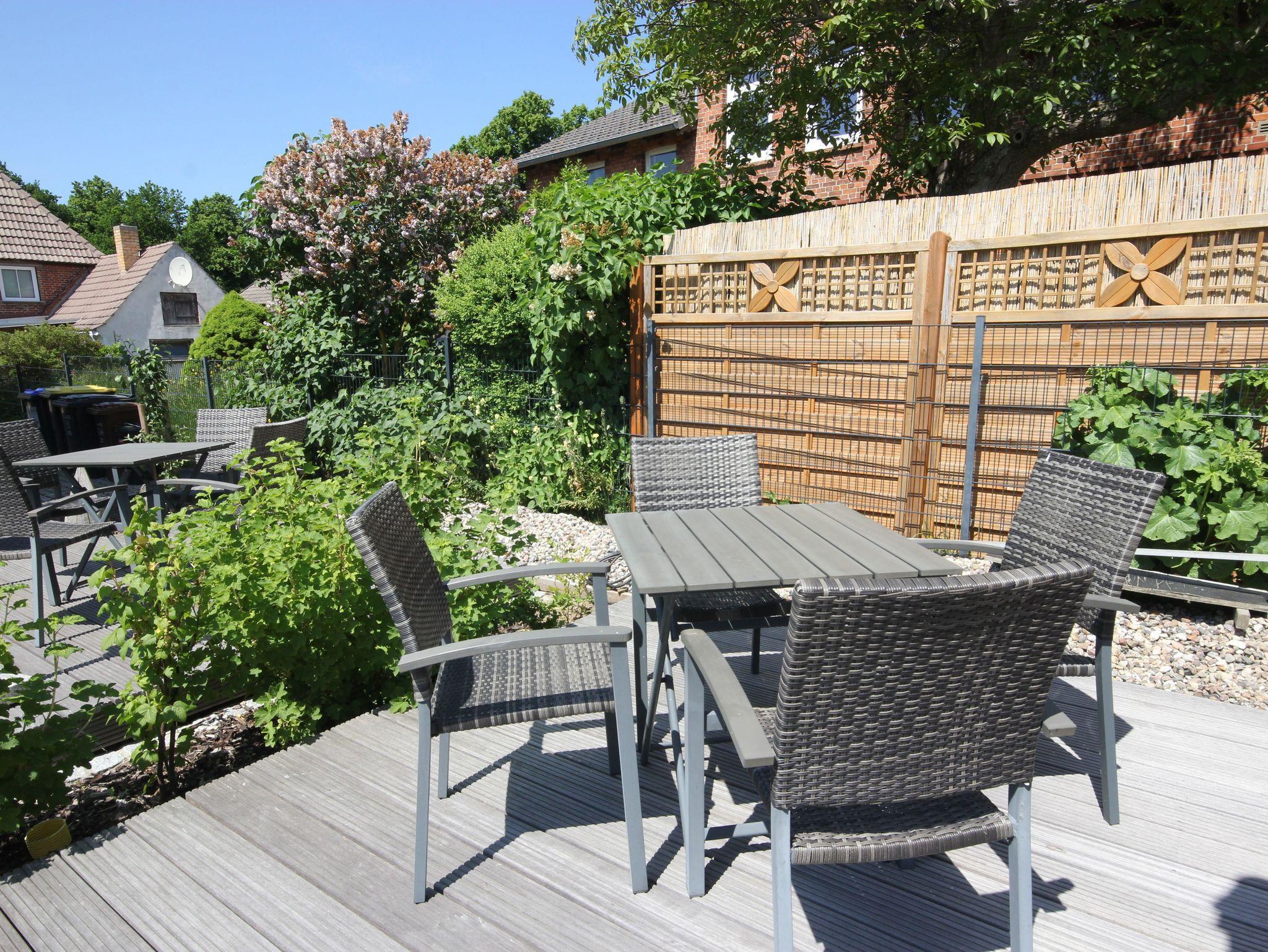 Die Ferienwohnung befindet sich im Obergeschoss und ist mit einer Terrasse und Gartenmöbeln im großzügigen Gartenbereich ausgestattet.