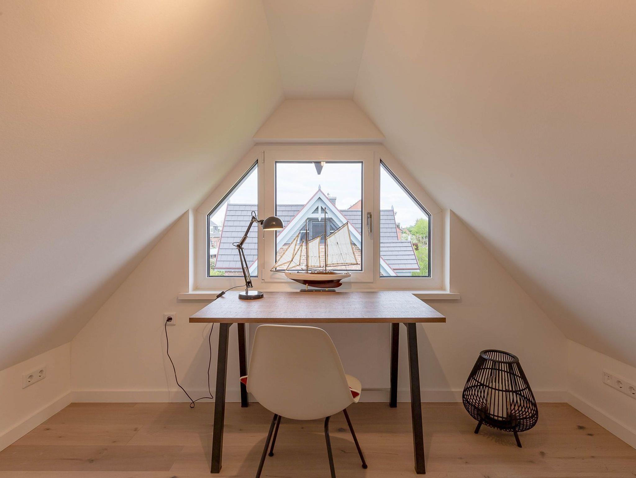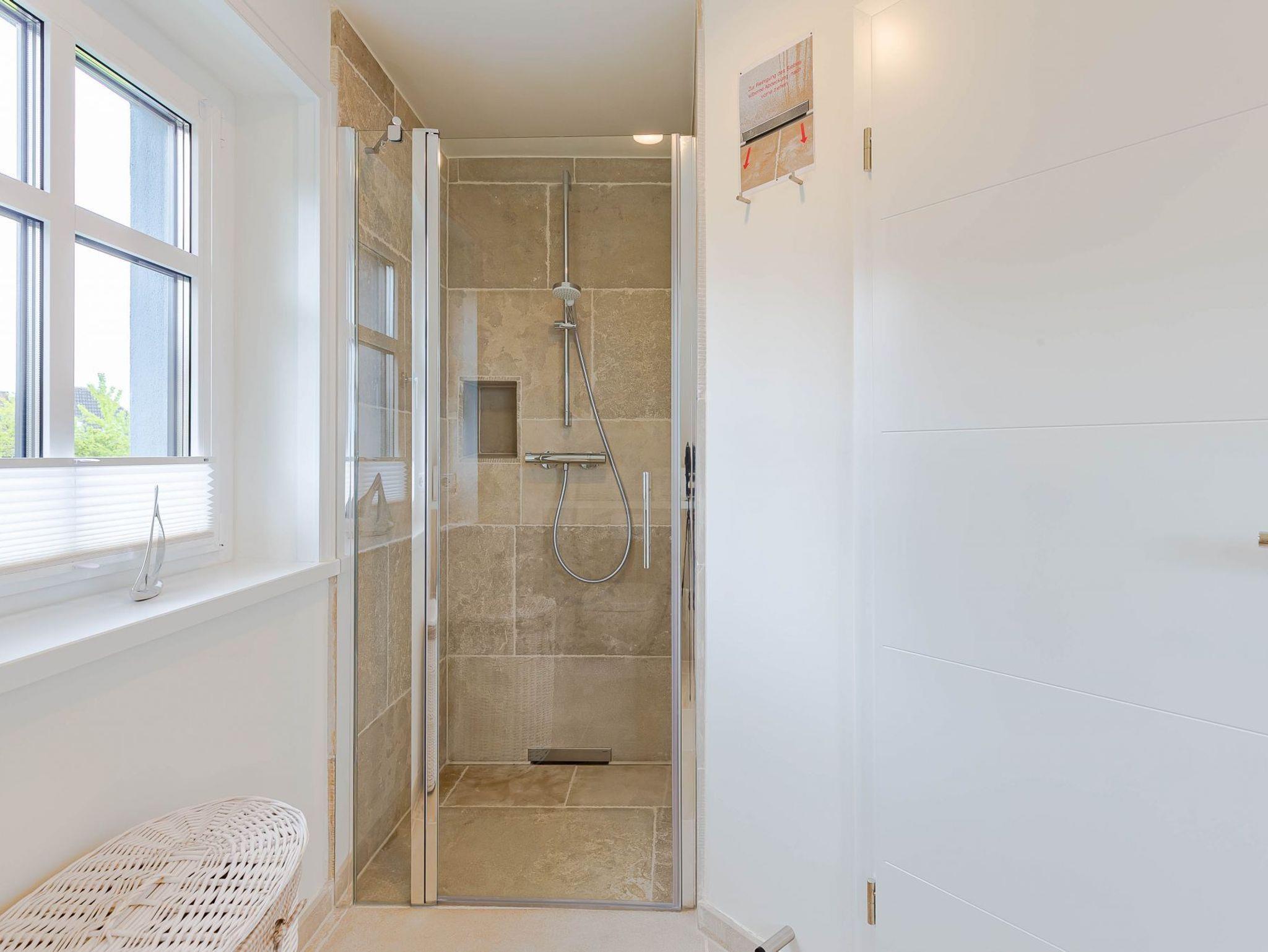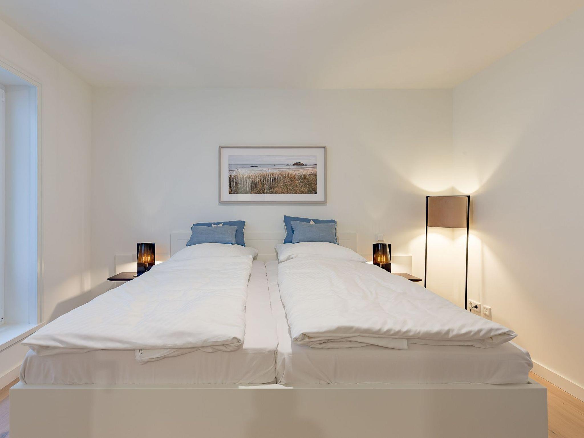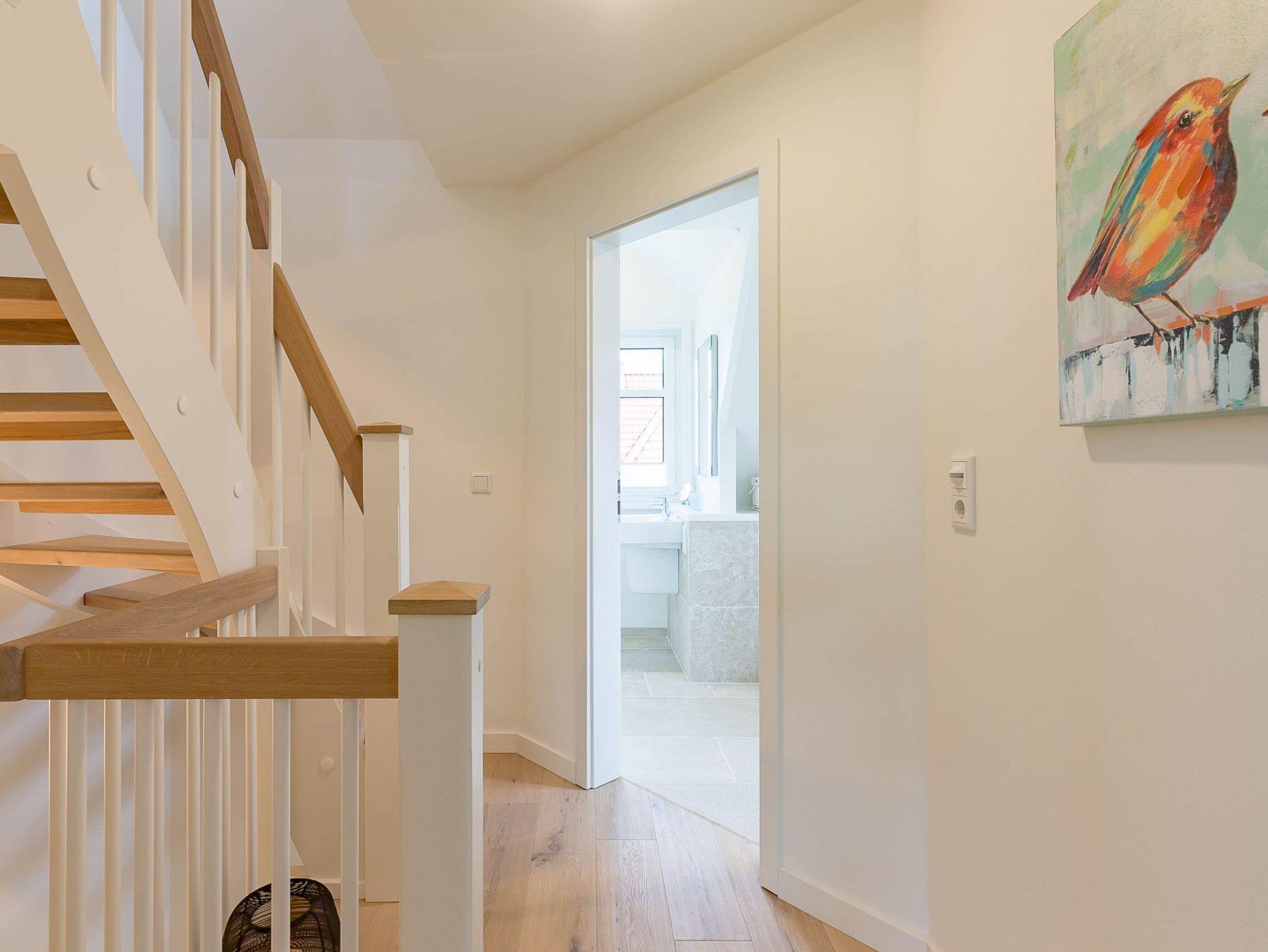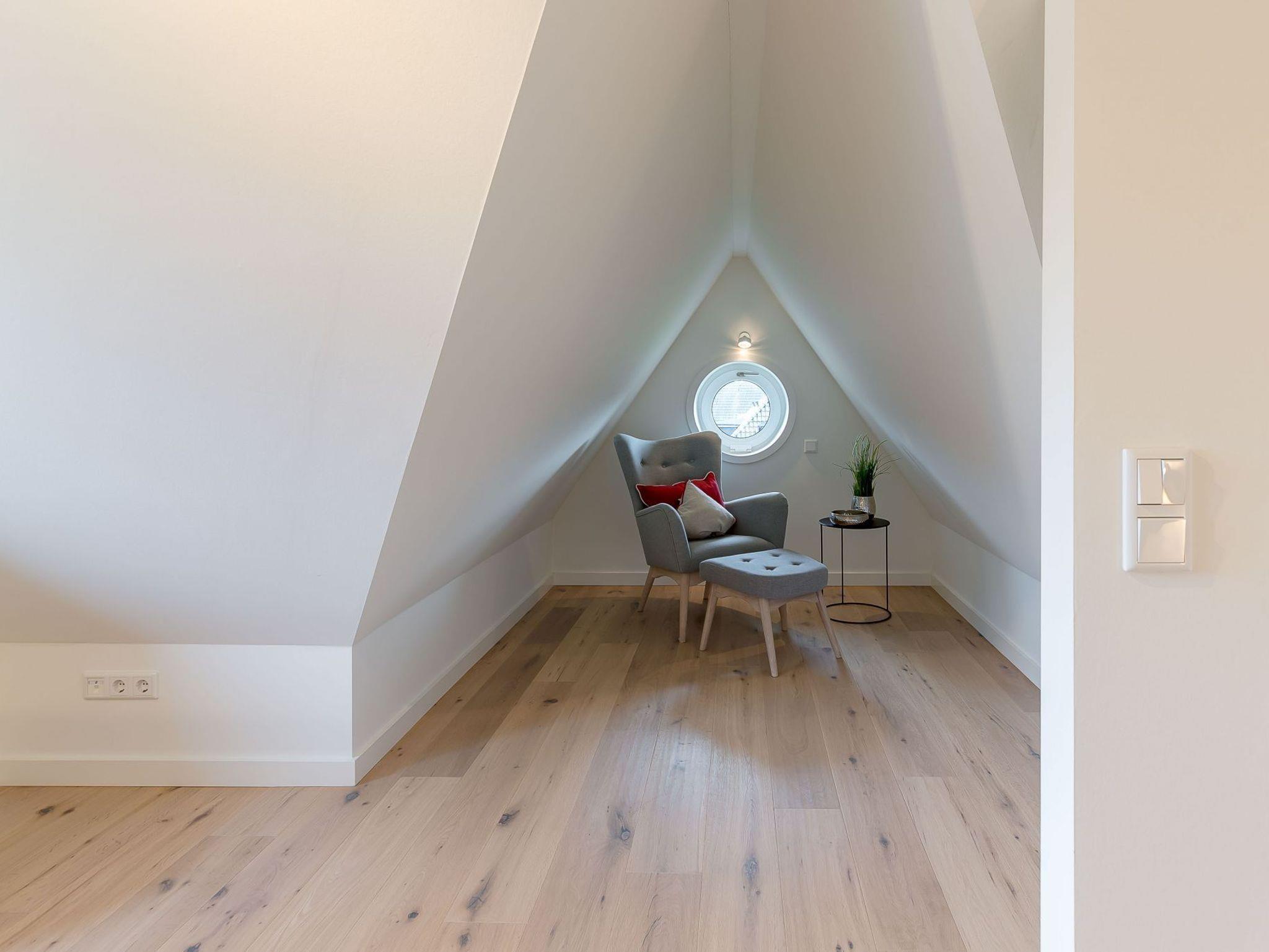 Von dort gelangen Sie über die zu gemütlichen Sonnenstunden einladende Terrasse in den Garten, wo Ihnen ein eigener Strandkorb zur Verfügung steht. Im Untergeschoss schaffen ein individuell von einer örtlichen Tischlerei eingerichtetes Doppelschlafzimmer sowie ein Bad mit bodentiefer Dusche und eine Sauna eine wohlige Atmosphäre. Der zweite ebenso hochwertig ausgestattete Doppelschlafraum befindet sich im Obergeschoss. Auch hier steht ein separates Bad mit bodentiefer Natursteindusche zur Verfügung.