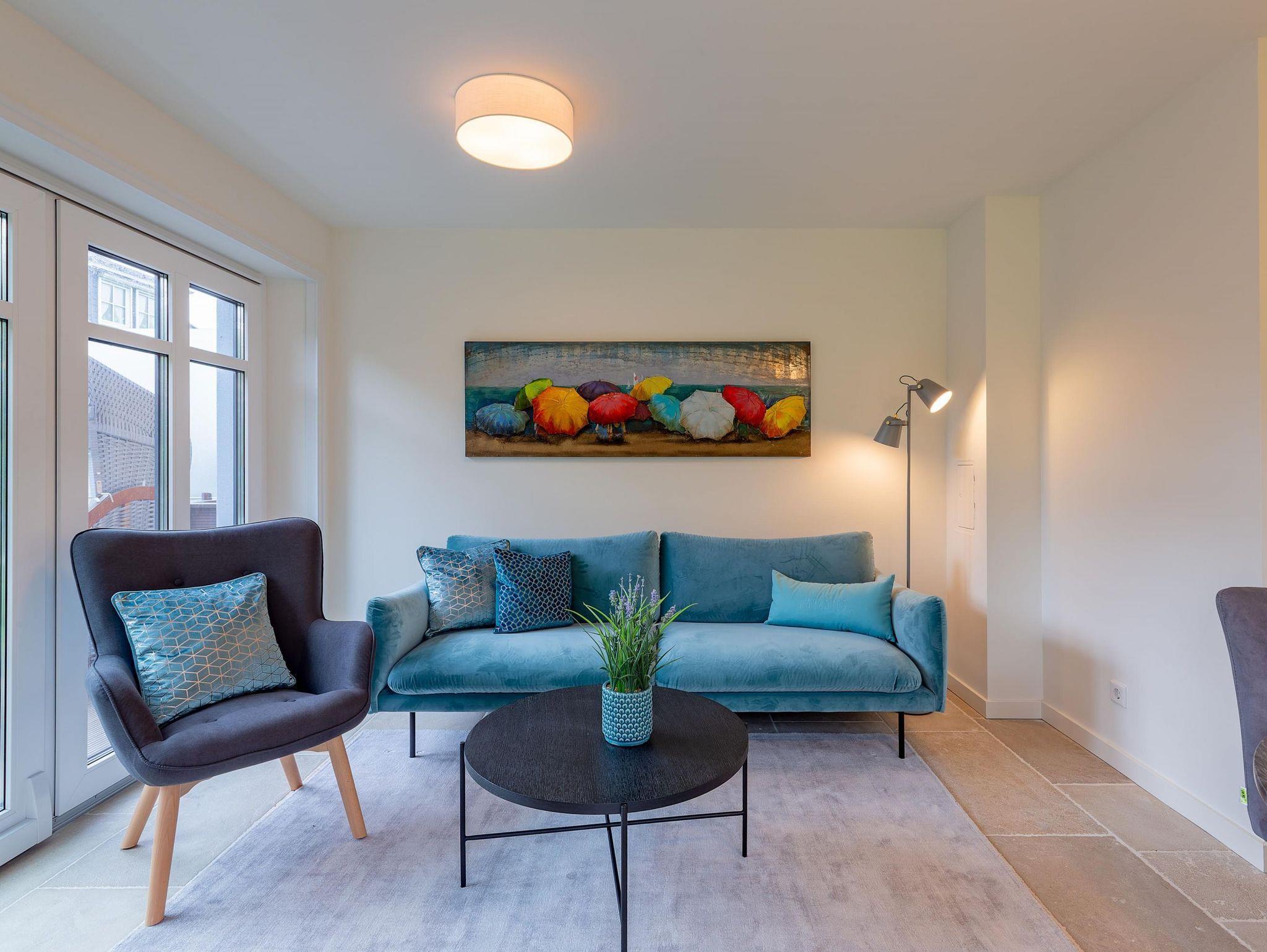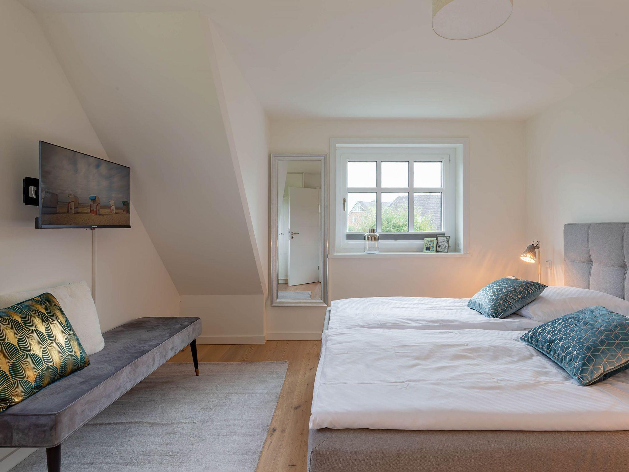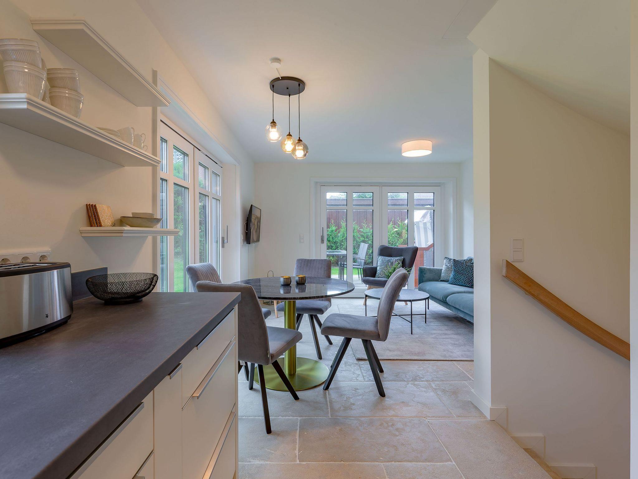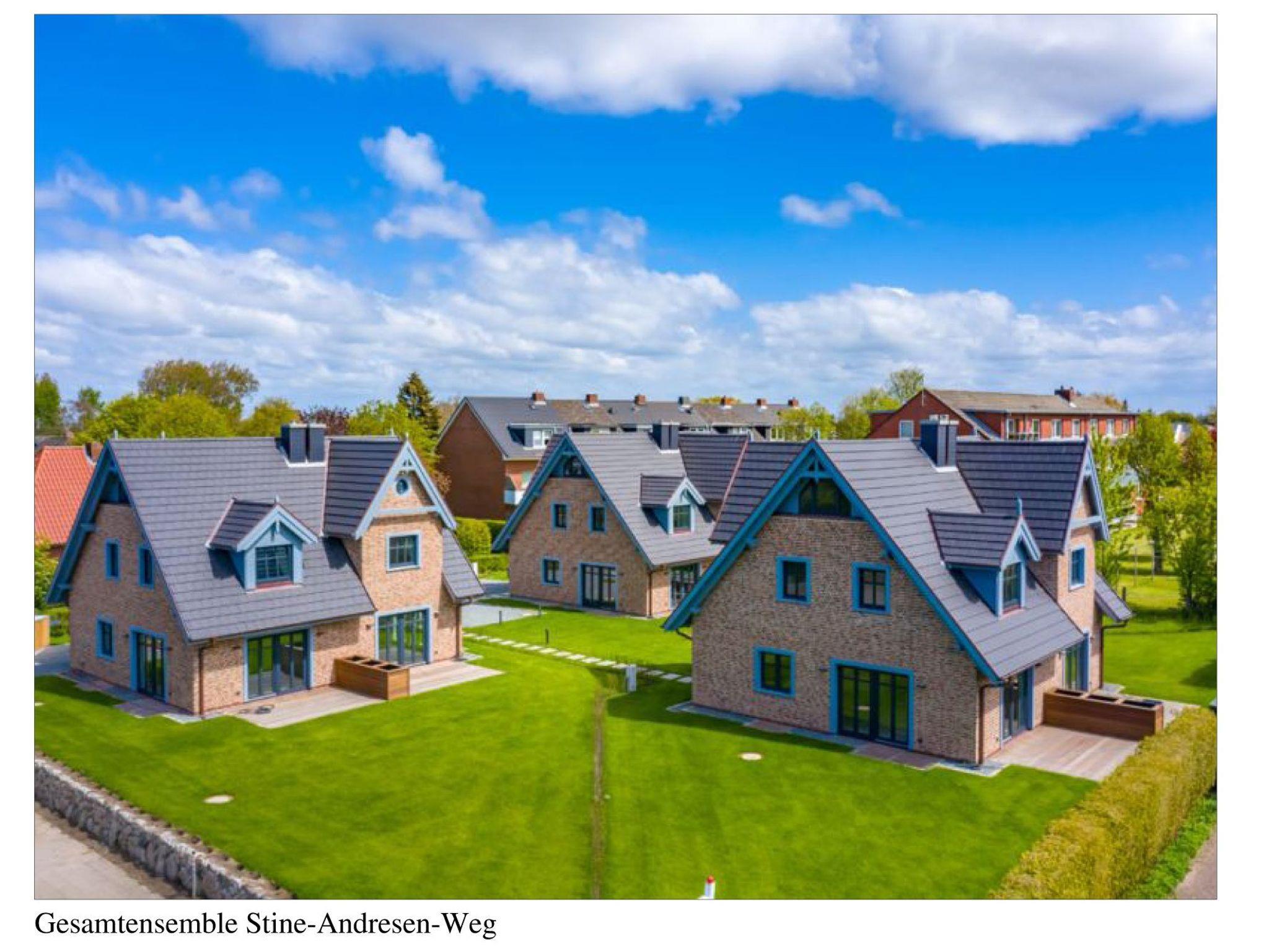 Modernes Wohnen im Stine-Andresen-Weg in Wyk auf Föhr. Der Stine-Andresen-Weg liegt westlich nur wenige Gehminuten vom Zentrum entfernt. Es handelt sich um eine ruhige Nebenstraße, in der sowohl Insulaner als auch Feriengäste leben. In fußläufiger Entfernung gelangen Sie zur Strandpromenade die zum Bummeln einlädt und sich fast 3 km lang erstreckt. Auch der Wyker Stadtwald und der Ortskern in Wyk liegen fußnah zum Stine-Andresen-Weg. Die Haushälfte ist durch die vielen bodentiefen Fenster lichtdurchflutet und modern ausgestattet. Eine Terrasse lädt zum Frühstücken uns relaxen ein. Sowohl im Obergeschoss als auch im Untergeschoss befindet sich ein großes Schlafzimmer mit Doppelbett und jeweils ein Bad mit bodenebener Dusche. Im Untergeschoss steht Ihnen eine Sauna zur Verfügung. Einem erholsamen und entspannten Urlaub steht nichts im Wege ? egal zu welcher Jahreszeit Sie einen Aufenthalt buchen. [nbsp]