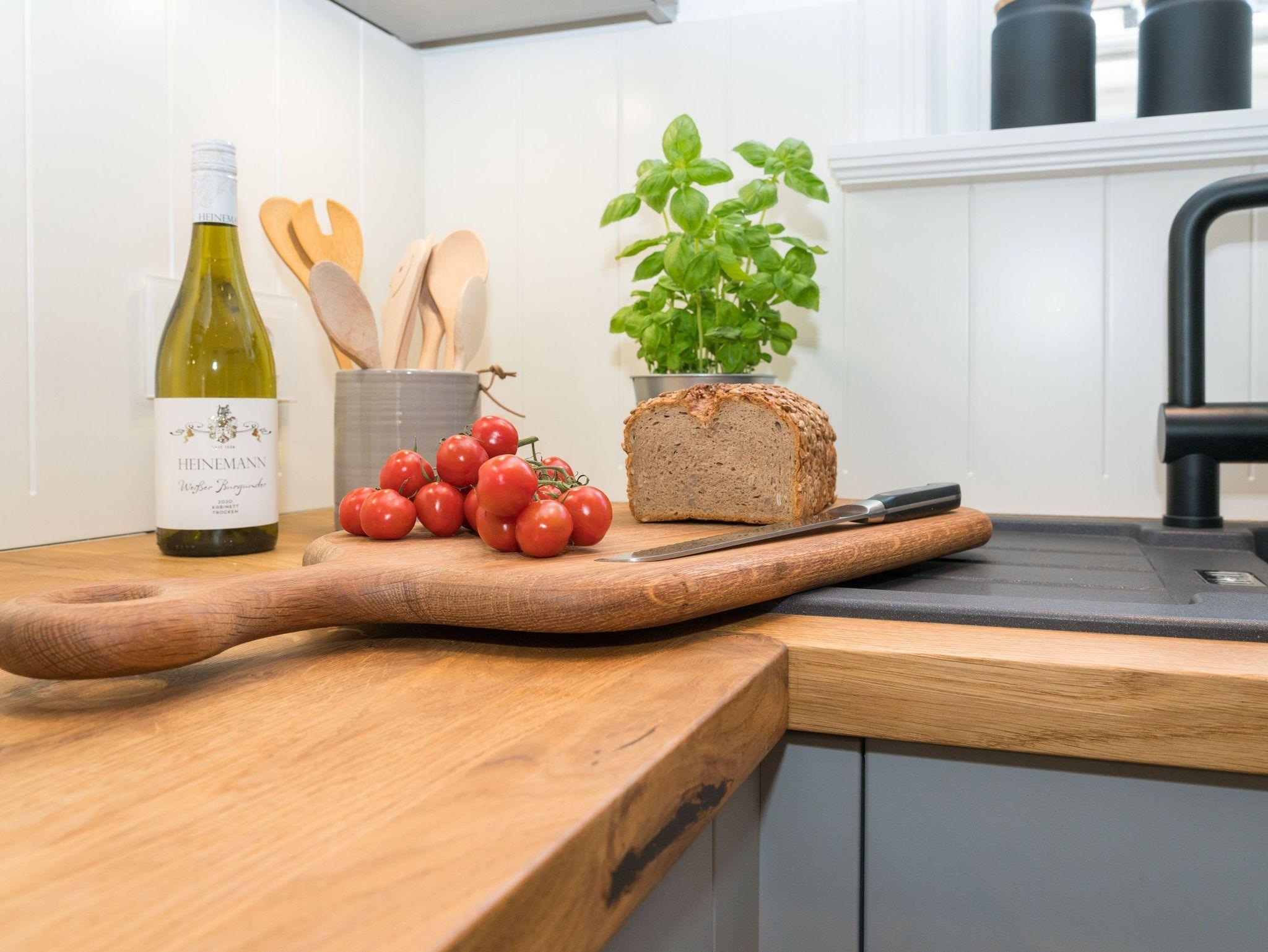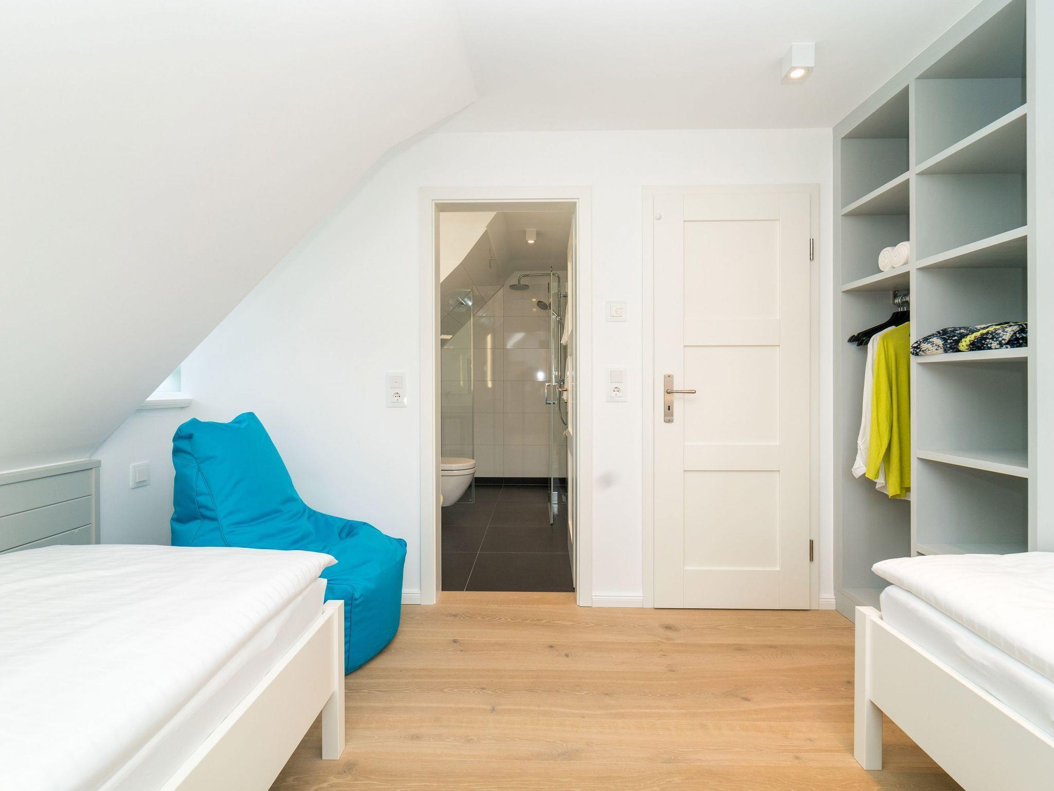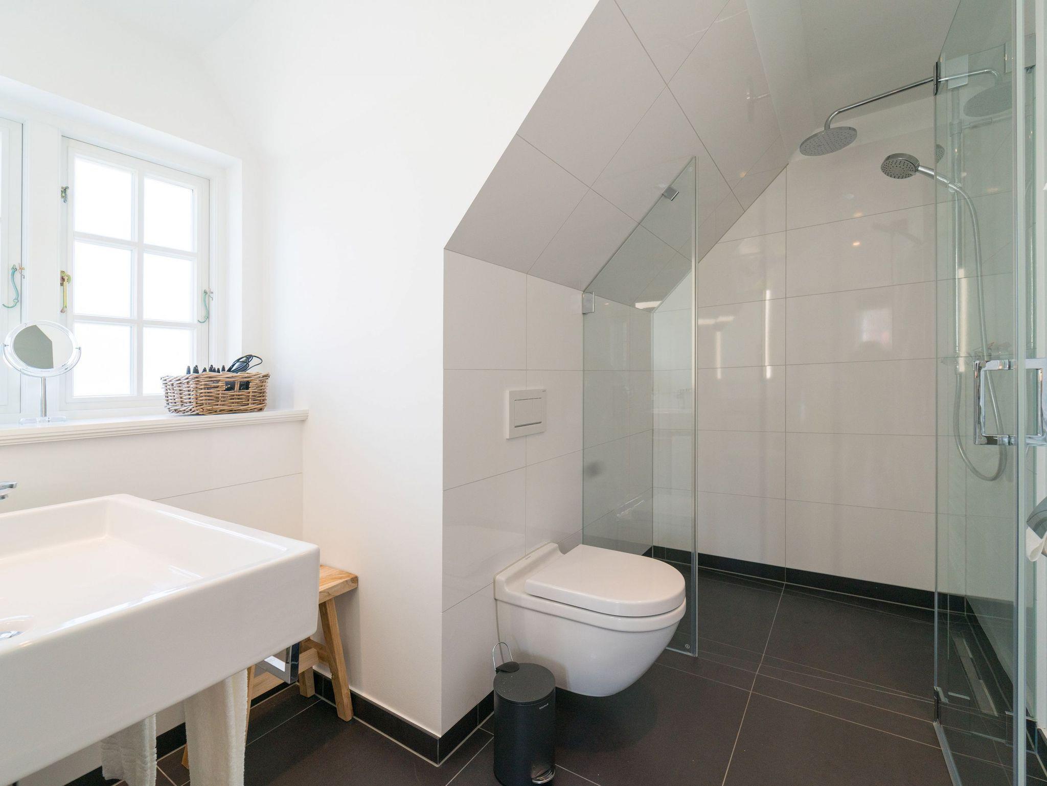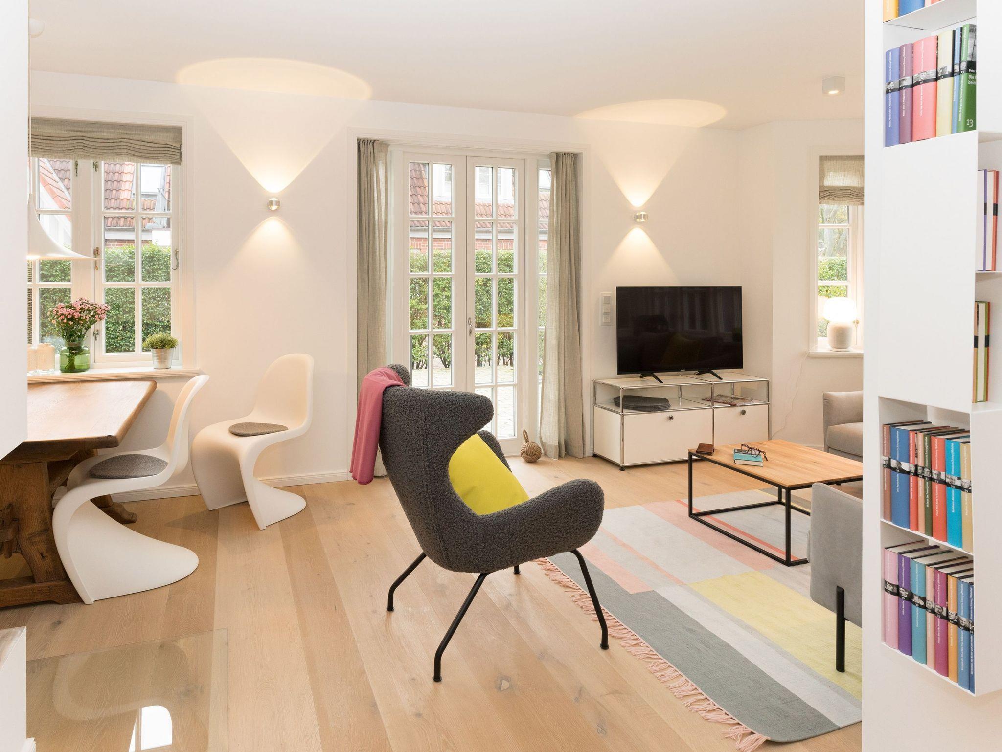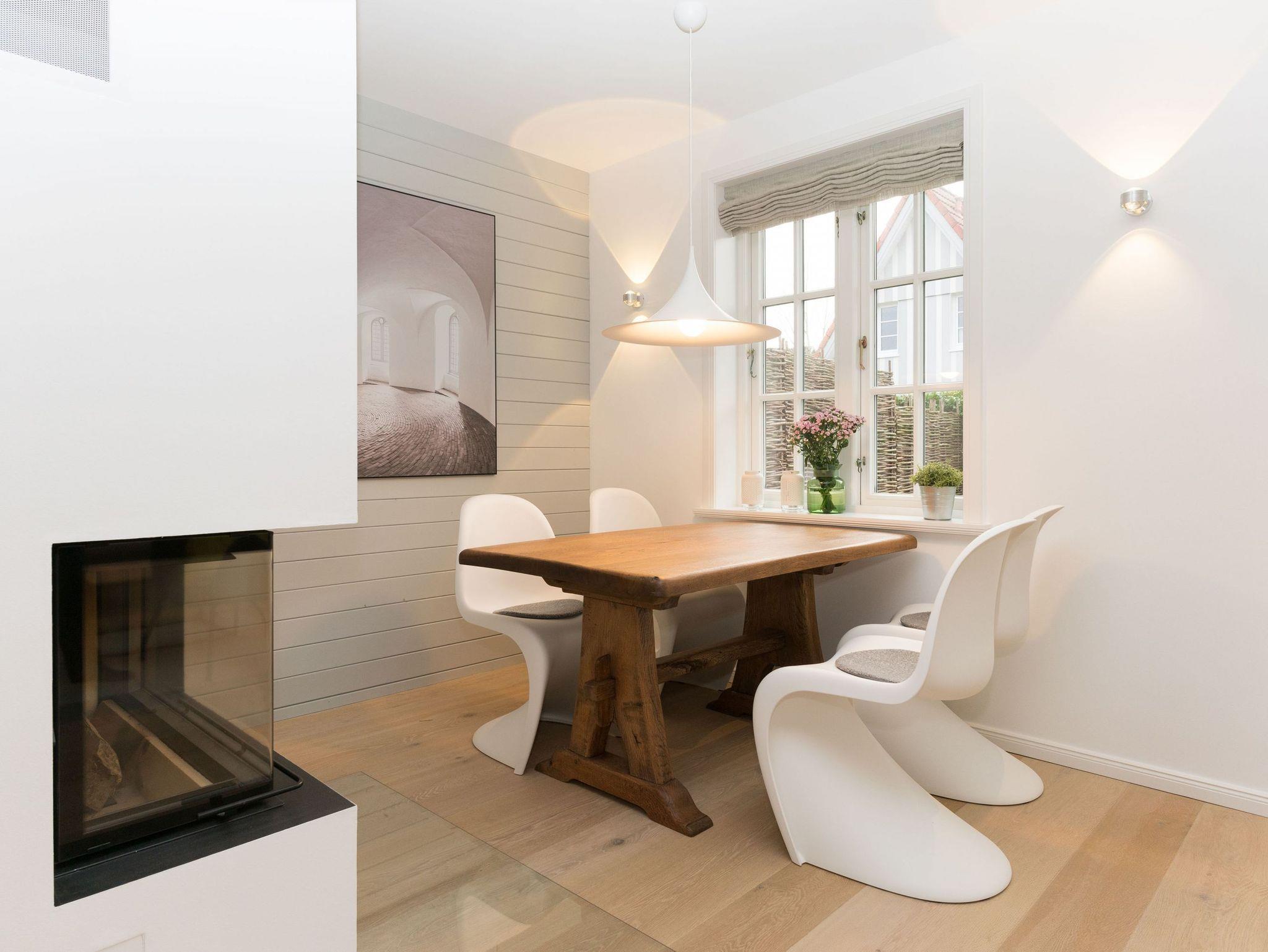 Ferienhaus Leichte Brise Meer, Sonne und immer eine leichte Brise - das ist Föhr und das ist die ruhig und zentral gelegene Leichte Brise? in Wyk. Moderne, klare Linien, nordische Leichtigkeit, massive Eichendielen und Designklassiker auf 105 qm über 3 Etagen als perfekte Urlaubsbasis für 4 Erwachsene und 1 Kleinkind (bis 3J.). Große Fensterflächen, Artemide und Gubi Leuchten schaffen lichtdurchflutete Räume. Im Erdgeschoss treffen USM Haller und Panton Stühle auf einen alten Eichentisch und eine Küche mit kompletter Ausstattung. Zwei gemütliche Sofas und ein moderner Ohrensessel sind die Relaxgrundlage für Fernsehabende, Lesestunden oder ein gutes Glas Wein am knisternden Kamin. Die Schlafzimmer jeweils mit Bettwäsche in Komfortgröße (155x220) und En-suite Bäder mit großer Dusche, versprechen Erholung im Schlaf. Und falls es im Urlaub doch mal eine E-Mail zu schreiben gibt, finden Sie einen kleinen Arbeitsplatz im Dachgeschoß. Die nach Süden ausgerichtete Terrasse mit großem Tisch und Standkorb schließt die Hausführung ab.