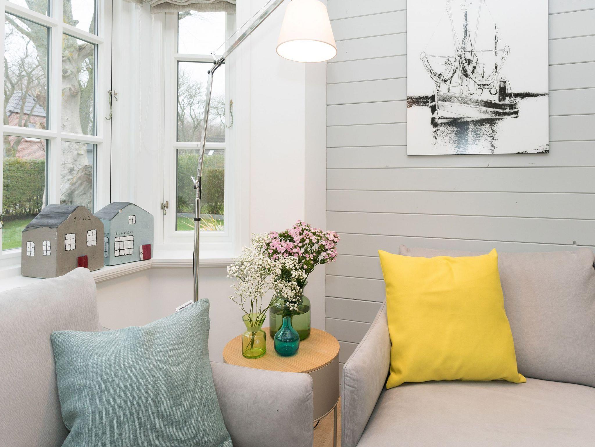 Ferienhaus Leichte Brise Meer, Sonne und immer eine leichte Brise - das ist Föhr und das ist die ruhig und zentral gelegene Leichte Brise“ in Wyk. Moderne, klare Linien, nordische Leichtigkeit, massive Eichendielen und Designklassiker auf 105 qm über 3 Etagen als perfekte Urlaubsbasis für 4 Erwachsene und 1 Kleinkind (bis 3J.). Große Fensterflächen, Artemide und Gubi Leuchten schaffen lichtdurchflutete Räume. Im Erdgeschoss treffen USM Haller und Panton Stühle auf einen alten Eichentisch und eine Küche mit kompletter Ausstattung. Zwei gemütliche Sofas und ein moderner Ohrensessel sind die Relaxgrundlage für Fernsehabende, Lesestunden oder ein gutes Glas Wein am knisternden Kamin. Die Schlafzimmer jeweils mit Bettwäsche in Komfortgröße (155x220) und En-suite Bäder mit großer Dusche, versprechen Erholung im Schlaf. Und falls es im Urlaub doch mal eine E-Mail zu schreiben gibt, finden Sie einen kleinen Arbeitsplatz im Dachgeschoß. Die nach Süden ausgerichtete Terrasse mit großem Tisch und Standkorb schließt die Hausführung ab.
