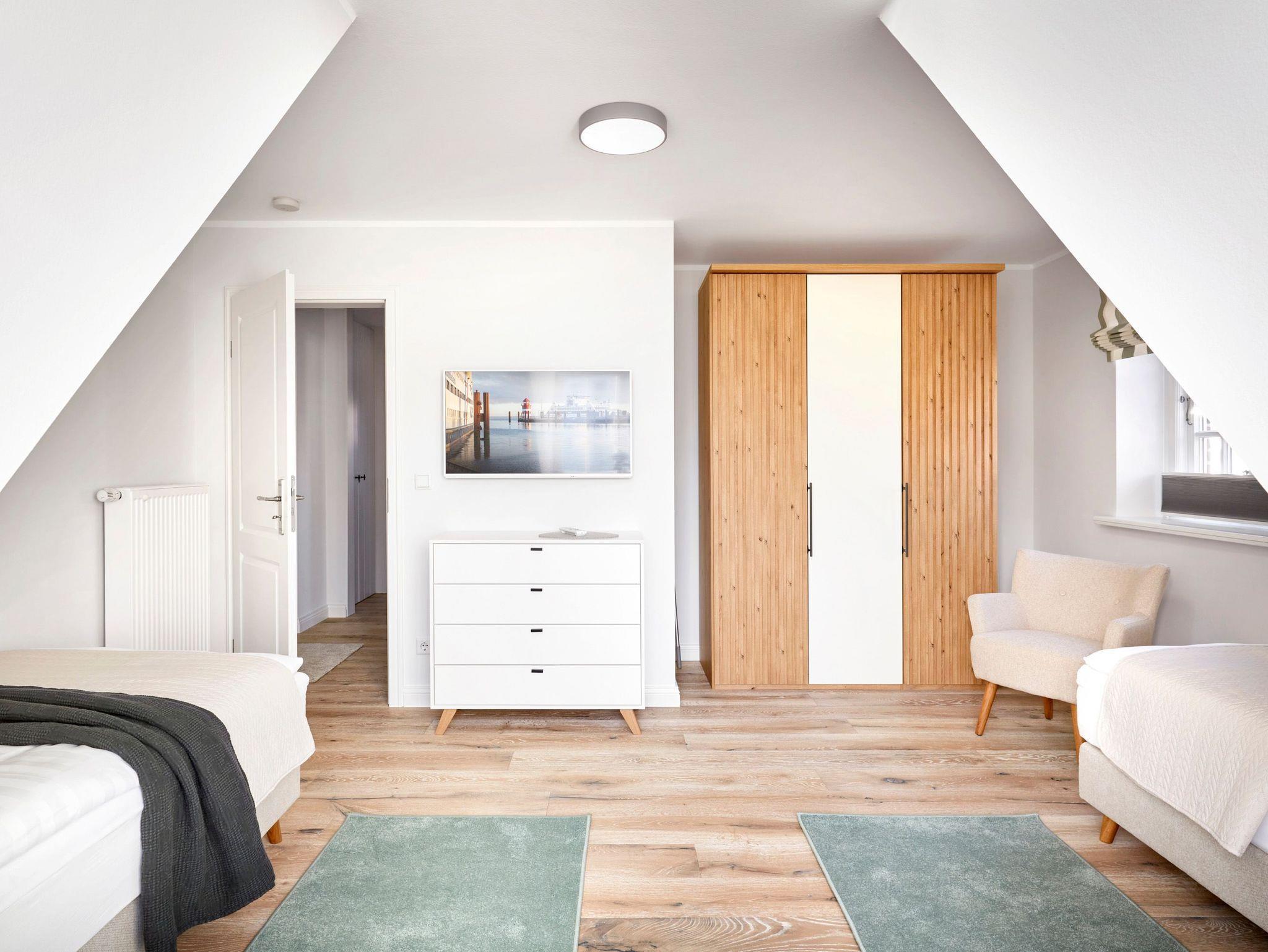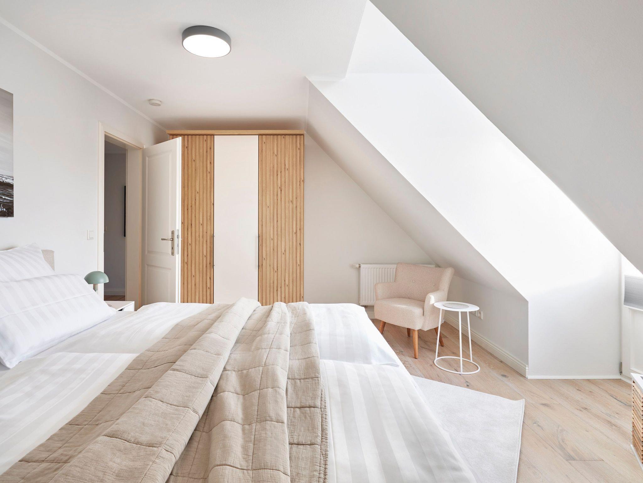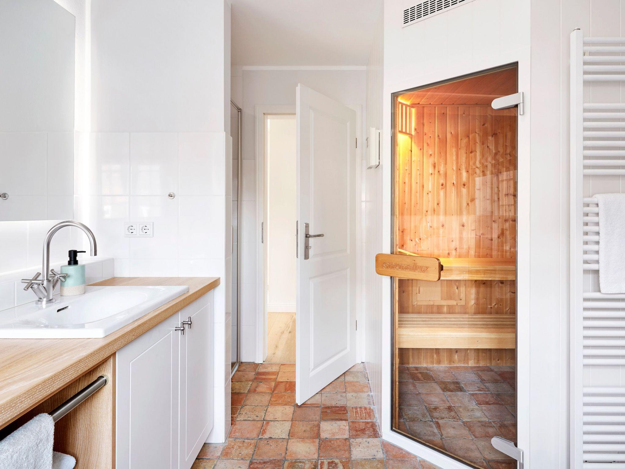 Im Obergeschoss erwartet Sie eine private Wellness-Oase mit Sauna und Badewanne, eingebettet in ein stilvolles Duschbad. Zudem stehen drei behagliche Schlafzimmer zur Verfügung ? zwei mit Doppelbetten, eines mit zwei Einzelbetten. Zwei der Schlafzimmer bieten direkten Zugang zu einem Balkon.