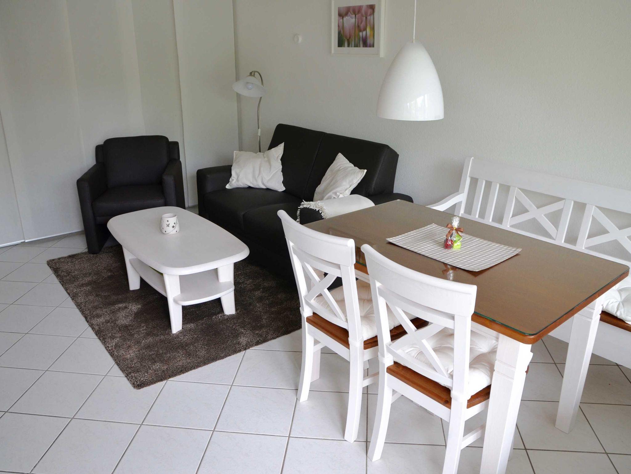 Die Wohnungen verfügen entweder über eine Terrasse mit Strandkorb. Die Ferienwohnungen bieten auf ca. 46qm Platz für 2 Erwachsene und bis zu 2 Kindern. Die Ferienwohnung unterteilt sich in Küche, Flur, Duschbad, Kinderzimmer mit Etagenbett (Zustellmöglichkeit Babybett vorhanden) und ein großes Wohn-Schlafzimmer. Die Höhe des Etagenbettes ist so angemessen, dass auch für Erwachsene, die getrennt schlafen möchten, der Einstieg bequem ist.