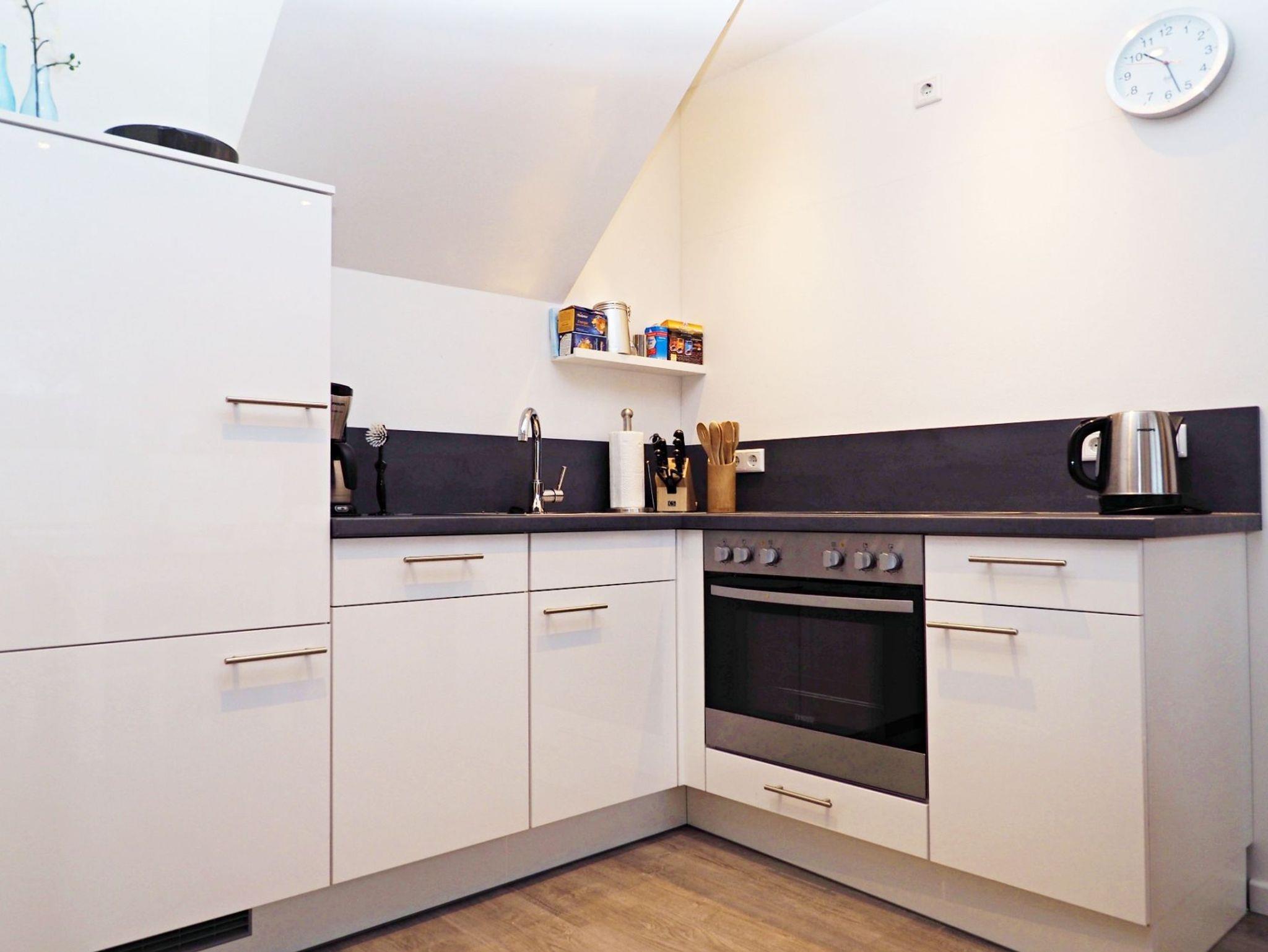 Die Küche ist voll ausgestattet mit einem Herd mit Backofen, Kaffeemaschine, Wasserkocher, Toaster und Eierkocher. Im Wohnzimmer lädt eine gemütliche Leseecke zum Entspannen ein.
