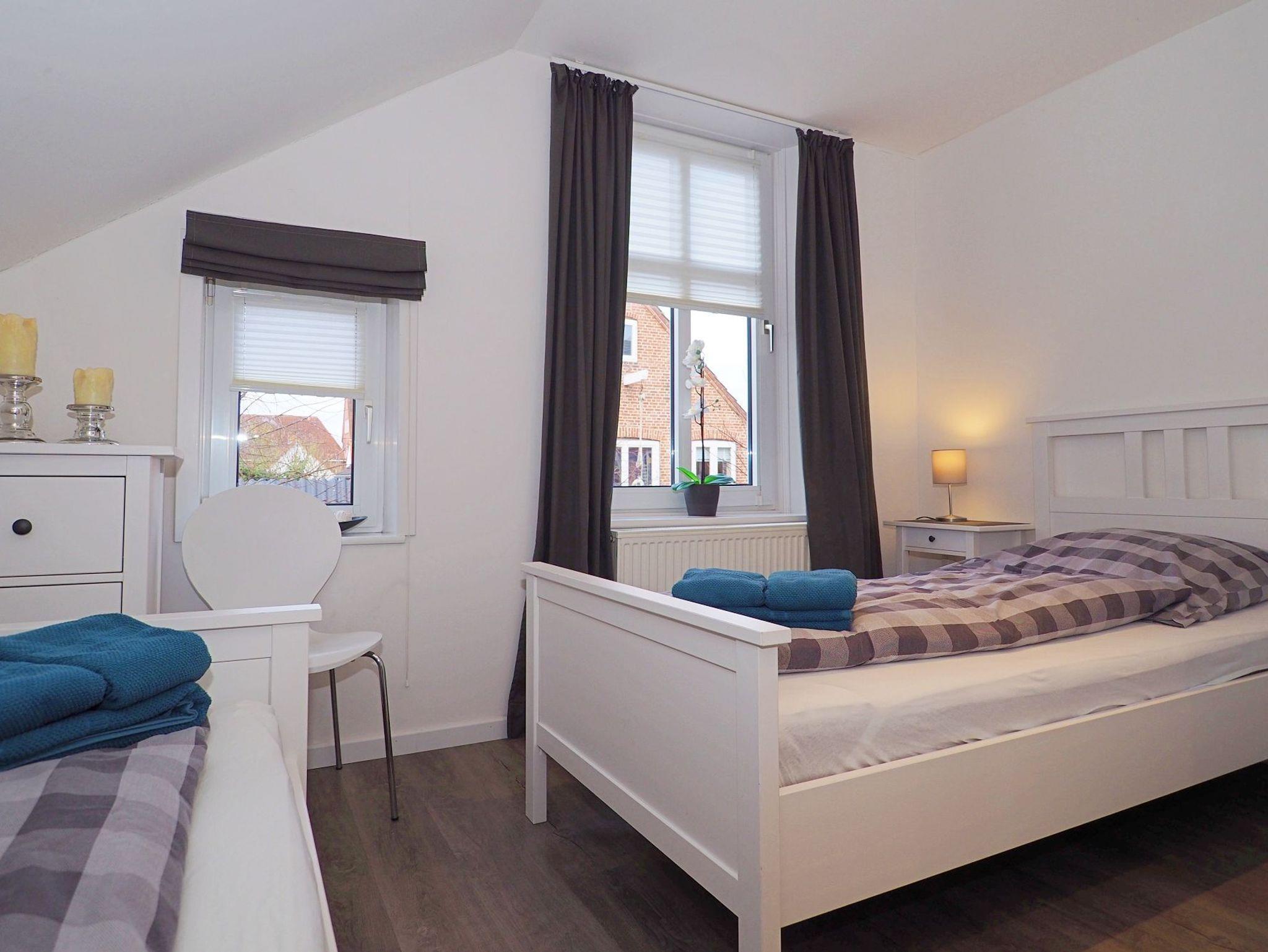 Die zwei separaten Schlafzimmer mit jeweils einem Doppelbett (1,80m x 2,00m) und 2 Einzelbetten (1,00m x 2,00m), Kleiderschrank und Kommode, liegen in Richtung Fußgängerzone. In einem der beiden Schlafzimmer befindet sich ein extra TV.