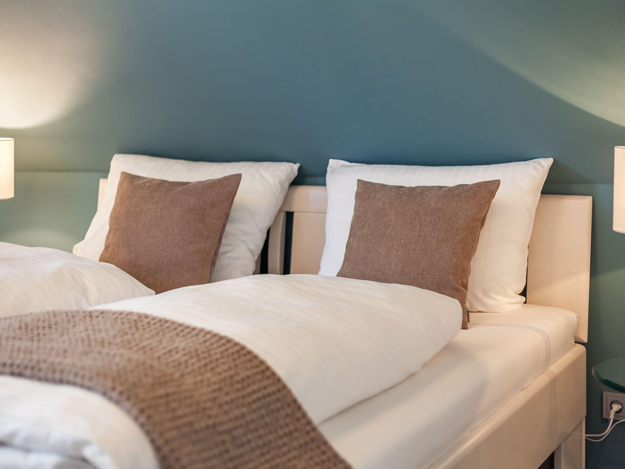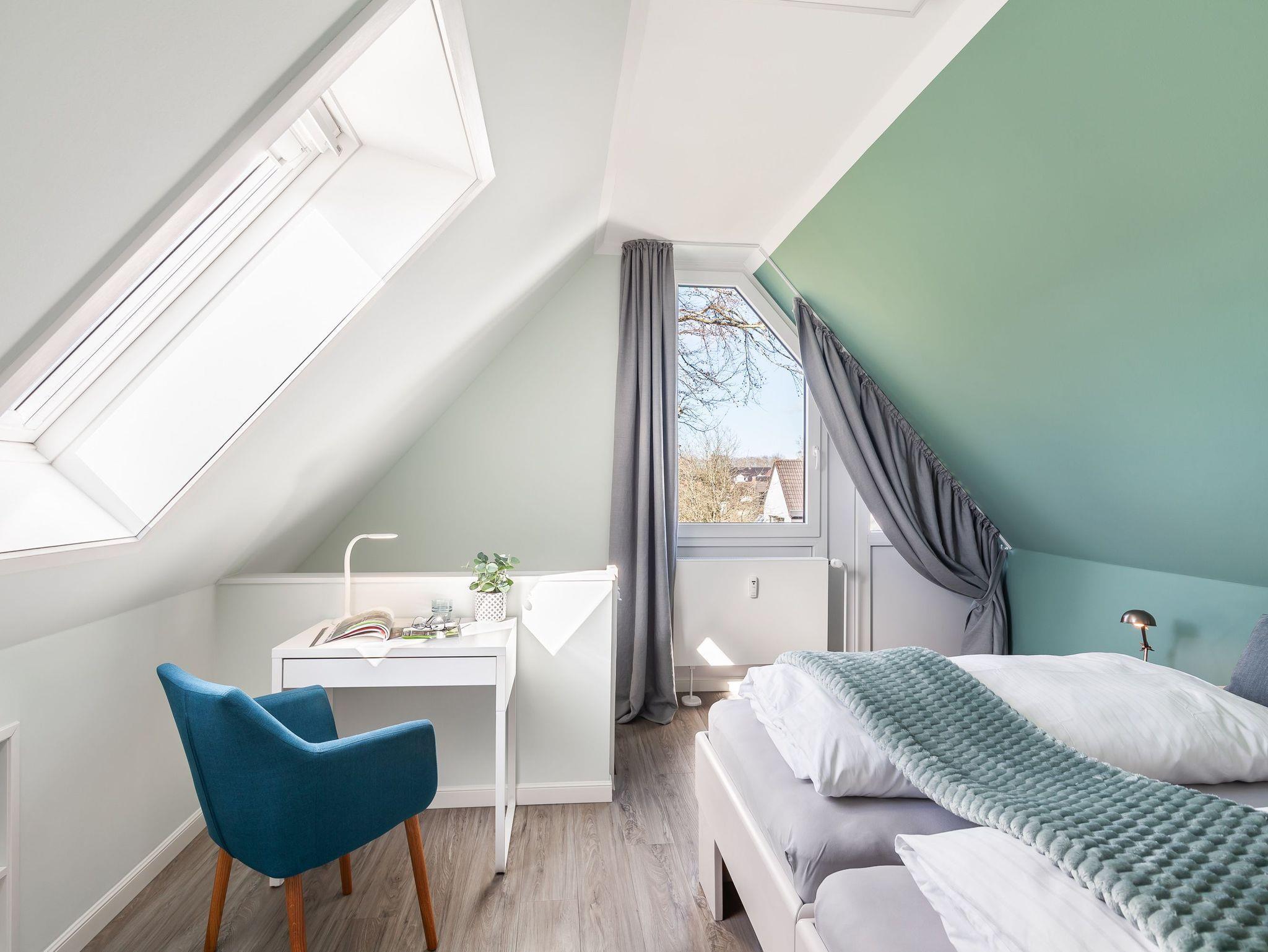 Es sind zwei Schlafzimmer vorhanden, einmal ein Schlafzimmer mit Doppelbett[nbsp]und ein weiteres Schlafzimmer mit Einzelbetten (können auch zum Doppelbett gestellt werden) im großzügigen Dachgeschoss. [nbsp]Im Keller des Hauses befinden sich Waschmaschine und Trockner, die über Münzer mit benutzt werden können.