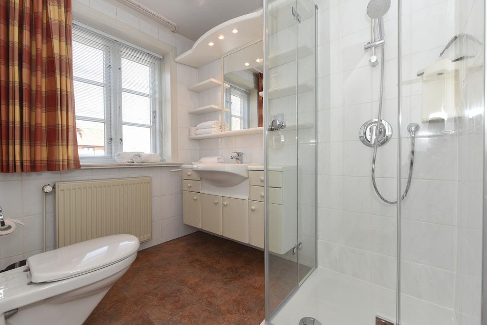 Das Ferienhaus verfügt über insgesamt vier Sanitärräume: Im Obergeschoss erwartet Sie ein großzügiges Vollbad mit Badewanne, separater Dusche und WC sowie ein weiteres Badezimmer mit Dusche und WC. Ein Gäste-WC befindet sich im Erdgeschoss.