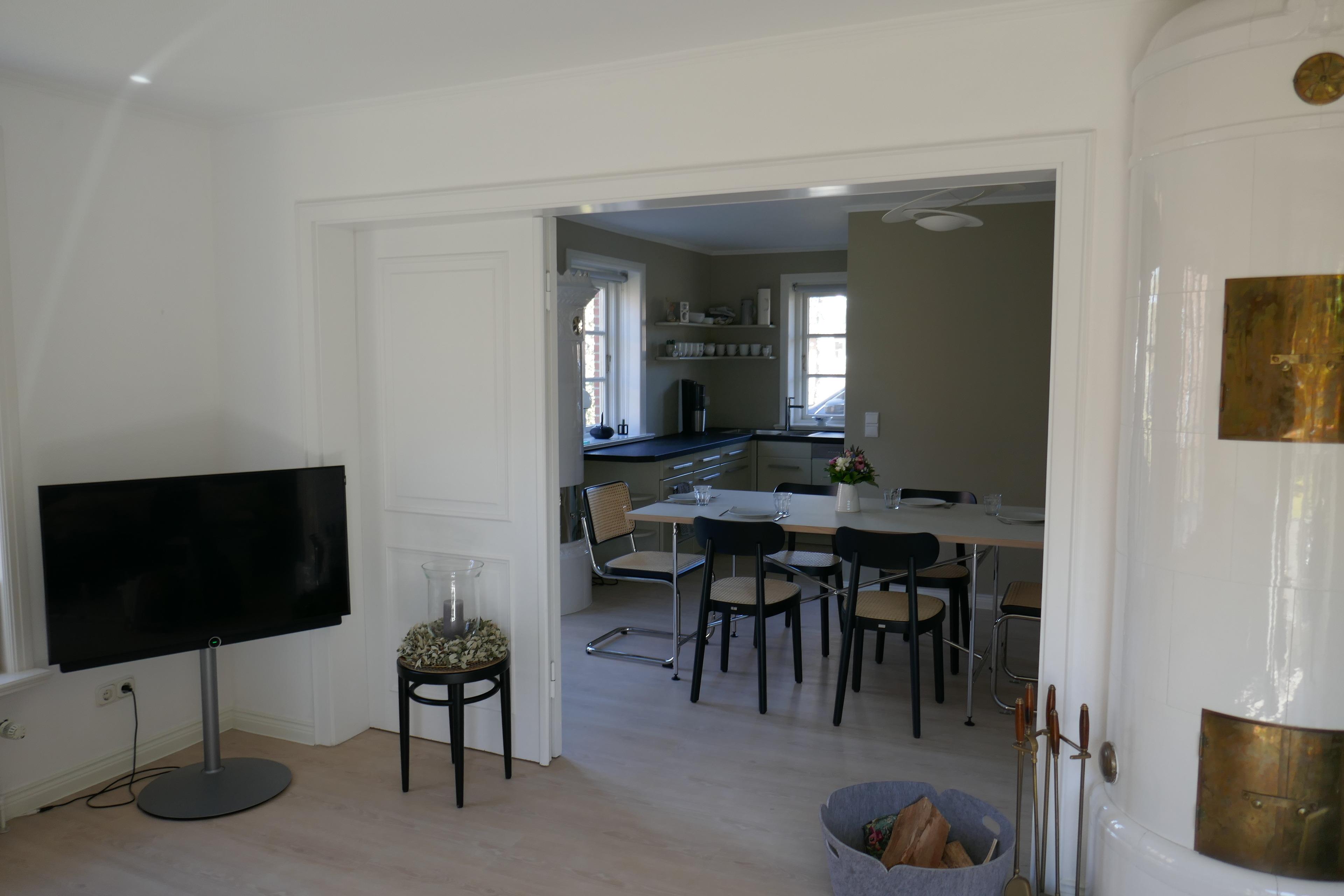 Ein großzügiges und liebevoll eingerichtetes Wohnzimmer, das keine Wünsche offenlässt. Der Kaminofen sorgt für wohlige Wärme, während der Flachbildschirm und das WLAN für Ihre Unterhaltung sorgen. Die gemütliche Sitzgruppe und der große Esstisch bieten viel Platz für gemeinsame Mahlzeiten oder entspannte Stunden. Vom Wohnzimmer aus gelangen Sie direkt in den Garten und auf die sonnige Holzdielen-Terrasse – der perfekte Ort, um den Tag ausklingen zu lassen.