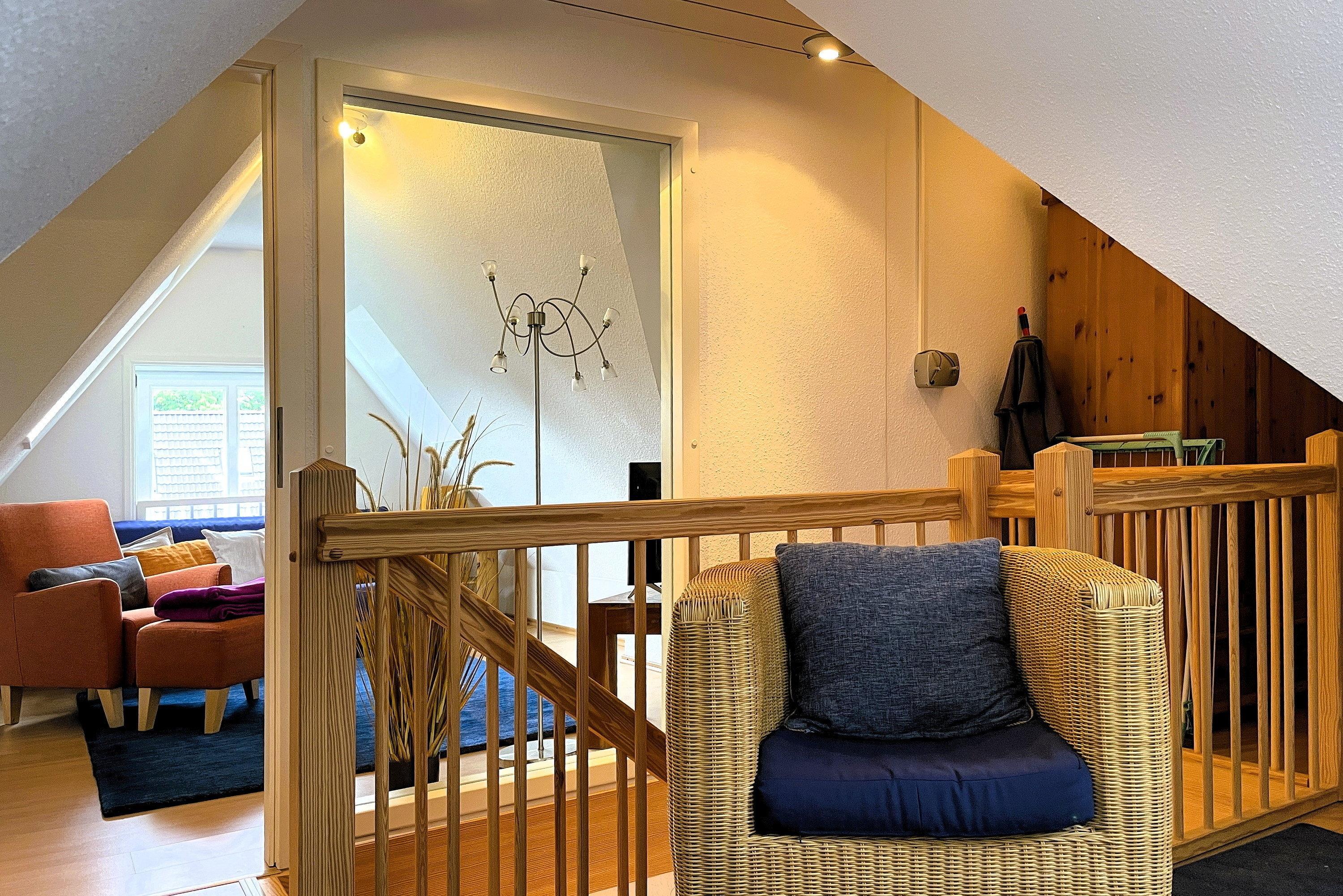 Die schöne Anlage Friesenperle in der Feldstraße 15 a und b besteht aus zwei Häusern mit jeweils 6 Wohneinheiten. Unsere hübsche ca. 45 m große Wohnung Friesenperle 5 befindet sich im ersten Obergeschoss des Hauses und erstreckt sich über zwei Etagen. Der offene Wohnraum mit einer gemütlichen Couch, WLAN, Stereoanlage sowie einer gemütlichen Essecke ist harmonisch aufeinander abgestimmt und lässt Sie die Urlaubstage genießen. Von hier aus gelangen Sie auf den Balkon, der in den Sommermonaten mit Gartenmöbeln bestückt ist. Die im Wohnzimmer integrierte Küchenecke mit Backofen, Mikrowelle, Wasserkocher und Kaffeemaschine ist gut ausgestattet, so dass es Freude macht, auch mal zu Hause zu Speisen. Weiterhin finden Sie im ersten Obergeschoss das Bad mit Dusche, welches hell gefliest und funktional ist. Ein Schlafraum, der ebenfalls mit einer Tür zum Balkon versehen ist, lädt zu herrlichen Nächten ein mit Doppelbett und Kleiderschrank. Eine Treppe führt Sie in das Dachgeschoss. Hier befindet sich im Galeriezimmer das Doppelbett und eine gemütliche Sitzgruppe mit Flachbild-TV, die sich hervorragend für Filmabenden oder für ein gemütliches Beisammensein anbietet, wenn man sie nicht gerade als Rückzugsmöglichkeit mit einem schönen Buch nutzen möchte. Auf dem Grundstück befindet sich eine kleine Grillecke, Abstellmöglichkeiten für Ihre Fahrräder, für jede Wohnung ein eigener Parkplatz sowie für unsere kleinen Gäste eine Doppelschaukel mit Kletterleiter um sich auszutoben. Im vorderen Gebäude steht allen Gästen zur gemeinschaftlichen Nutzung im Keller ein Waschraum mit Waschmaschine und Trockner ( jeweils gegen Gebühr), Wäscheständer und Bügelbrett mit Bügeleisen sowie eine Sauna (gegen Gebühr) mit Duschmöglichkeit und Ruheraum zur Verfügung. Durch die Lage in zweiter Reihe zur Straße ist die Anlage besonders bei befreundeten Familien, die gerne gemeinsam verreisen möchten beliebt, doch auch Pärchen verleben wunderbare Urlaubstage. Die zentrale Lage ermöglicht es in wenigen Minuten das Friesenmuseum, das Wellenbad Aqua Föhr und den Abenteuerspielplatz Löwenhöhle im nahe gelegenen Wald zu besuchen oder einen Spaziergang durch die hübschen Gassen der Wyker Innenstadt zu unternehmen, um die vielen freundlichen Cafés, Geschäfte und Restaurants kennenzulernen.