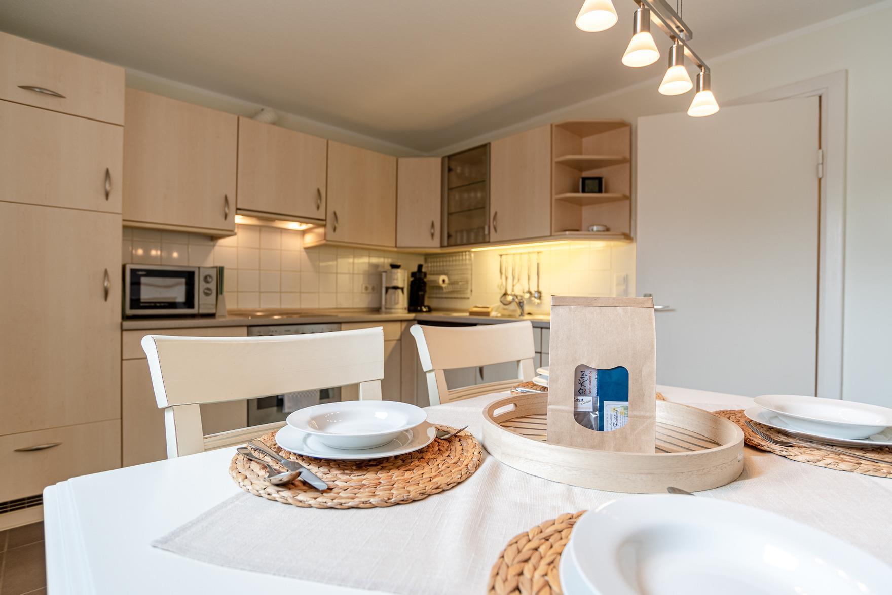 Genießen Sie Ihre Urlaubstage in einer liebevoll eingerichteten Wohnung mit hochwertigen Möbeln, schöner Dekoration und sehr guter Ausstattung, die keine Wünsche offenlässt. Die Zimmer erreichen Sie alle über den Flur. Die gemütliche Küche mit Essecke ist vollausgestattet und lässt keine Wünsche offen. Der Wohnbereich mit Zugang zur eigenen Terrasse (Möbel und Strandkorb im Sommer) ist geräumig und eine einladende L-Couch lädt zum Verweilen ein. Zudem finden Sie hier einen Flachbild-TV, WLAN und eine schöne Auswahl an Büchern. Das Bad mit Fußbodenheizung verfügt über ein Fenster, eine kostenfreie Waschmaschine und eine bodenebene Dusche. 2 Schlafräume versprechen ruhige Nächte. Das romantische Elternschlafzimmer verfügt über ein großes Boxspringbett (180x200cm) und einen Kleiderschrank. Im Kinderzimmer mit zwei Einzelboxspringbetten (90cm x 200 cm) und Schrank stehen Bücher und Spielzeug für unsere kleinen Gäste bereit.