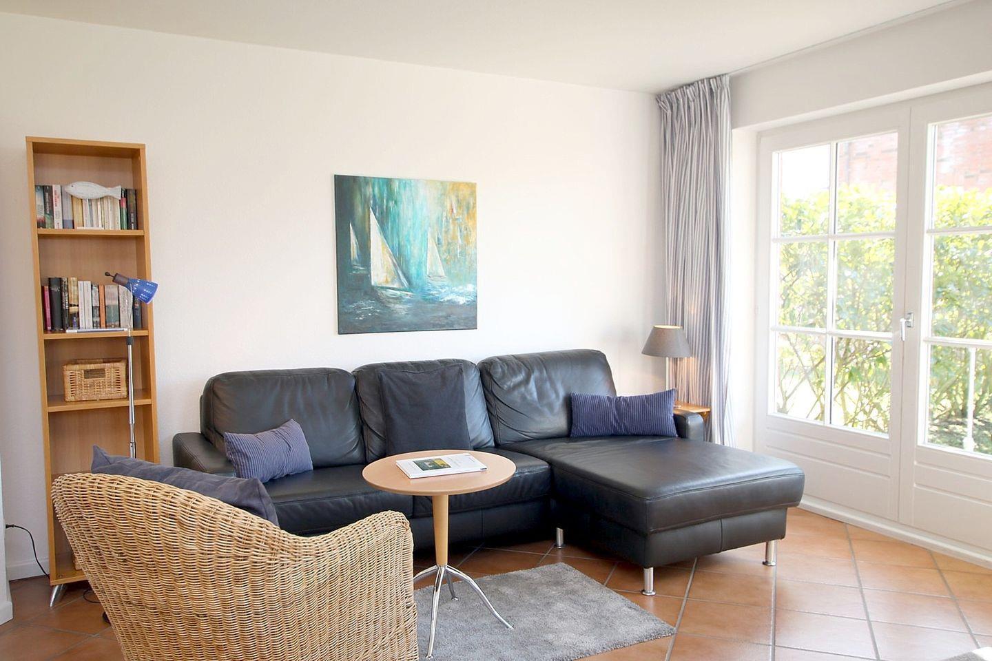 Die hellen 3-Zimmer-dieser Nichtraucher- Ferienwohnung verteilen sich auf ca.60 qm im Erdgeschoß mit toller Südwestterrasse und kleinem Gartenanteil. Das WOHNZIMMER ist ausgestattet mit einem gemütlichen Zweisitzer Sofa, zwei Sesseln und einem Couchtisch. Vom Wohnzimmer haben Sie einen direkten Zugang zur Terrasse mit Strandkorb (Saison von Mai - Mitte Oktober) und Gartenmöbeln.