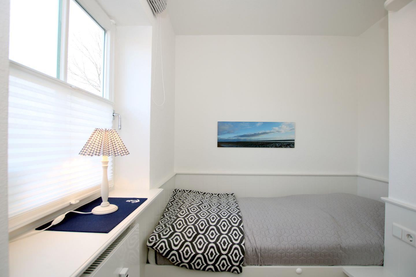 Schlafzimmer: 2 eingebautes Bett mit einer tatsächlichen Liegefläche von 2,12m x 1,00m, Einbauschrank, Sessel.