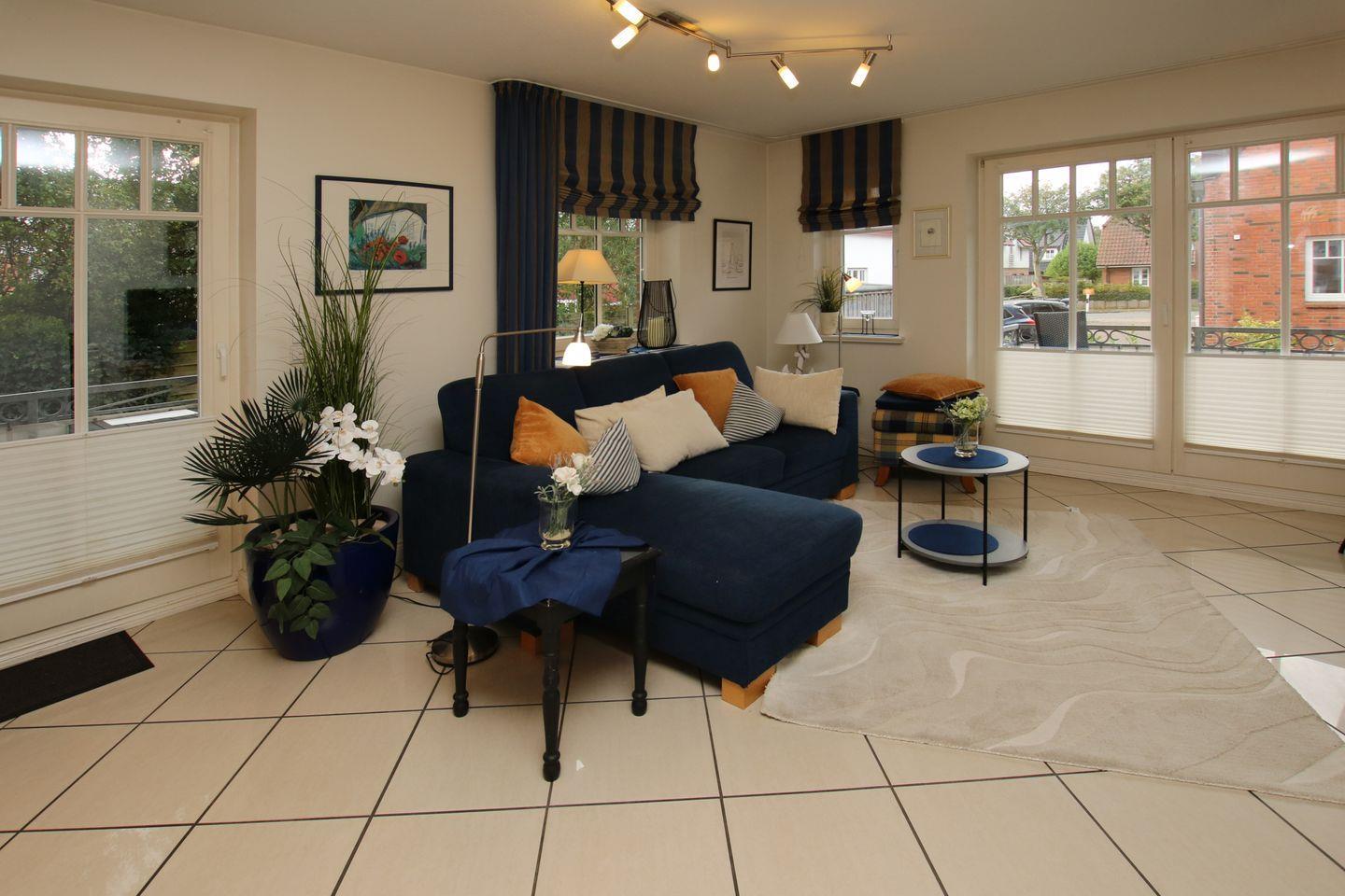 - Wohnzimmer mit 3er Sitzecke, Sessel, Hocker, Essplatz und Küchenzeile