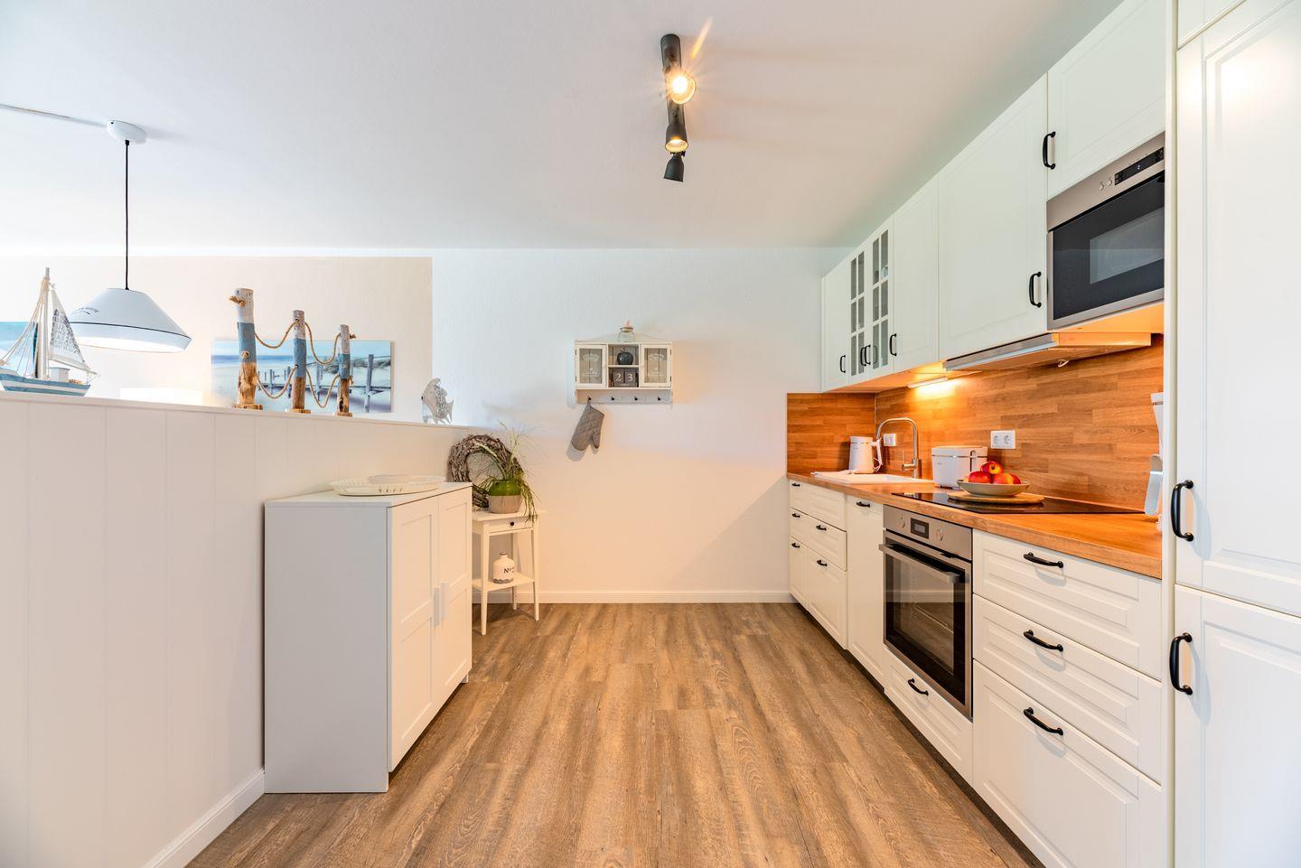 Offener Wohn- und Essbereich mit einer einladenden Sofaecke, einem Esstisch, einem Flachbildfernseher und einem Terrassenzugang. Die moderne Küche ist ausgestattet mit Herd, Backofen, Geschirrspüler und weiteren Annehmlichkeiten. Des weiteren stehen Ihnen zwei Schlafzimmer und ein Badezimmer zur Verfügung.