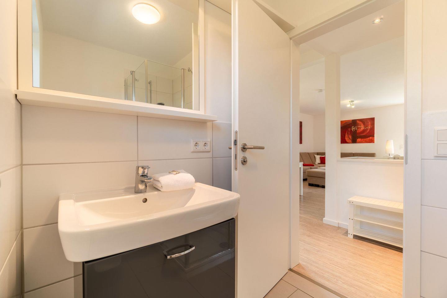 Die Ferienwohnung 1 überzeugt durch den großen, hellen, kombinierten Wohn-Essbereich mit der komplett ausgestatteten, integrierten Küche. Von hier aus haben Sie auch einen direkten Zugang auf die Terrasse und in den Garten. Die Wohnung verfügt über zwei Schlafzimmer im Souterrain sowie über zwei Duschbäder. Die moderne Ausstattung der Wohnung wird Sie überzeugen, ebenso wie der große Smart-TV im Wohnbereich. Ein Flachbildfernseher ist auch in einem der beiden Schlafzimmer vorhanden.