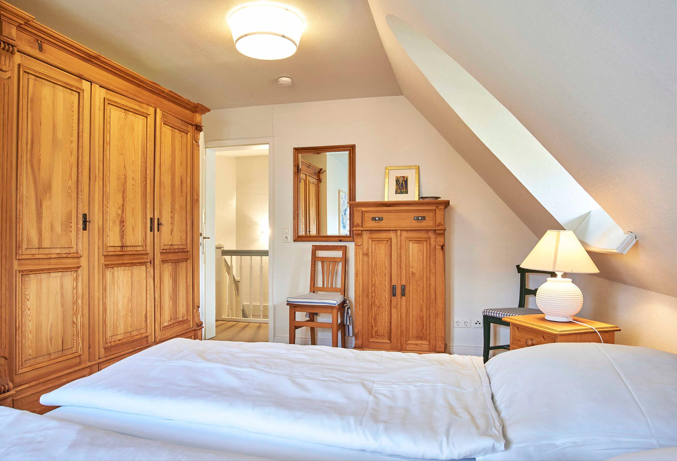 Das Obergeschoss verfügt über zwei Schlafzimmer: 1 Doppelbett im Elternschlafzimmer, 2 Einzelbetten im Stil von Alkoven im Kinderzimmer sowie eine kleine Spielgalerie im Flur laden zum Verweilen ein. Das Duschbad ist mit WC ausgestattet. Das gesamte Mobiliar ist hochwertig und sehr liebevoll zusammengestellt. Auf der Süd-Terrasse, mit bequemen Möbeln und Strandkorb, kann man die Stunden im Freien genießen. Dabei wünschen wir Ihnen bereits jetzt viel Vergnügen und hoffen, dass die Nordseeluft und das Wetter dazu beitragen!