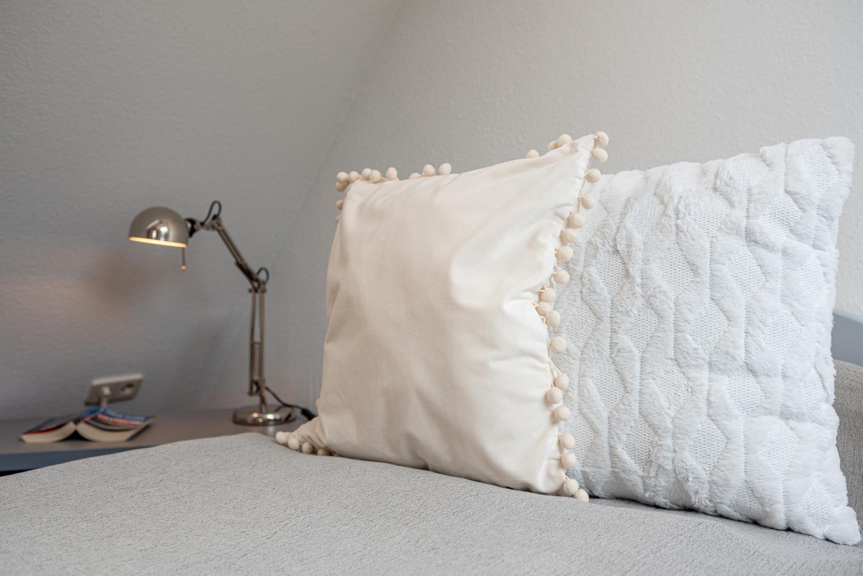 Über die Treppe vom Wohnraum aus kommt man ins helle Dachgeschoss, in welchem sich der Schlafbereich befindet. Ein Einbauschrank bietet genug Platz für Kleidung und Koffer.