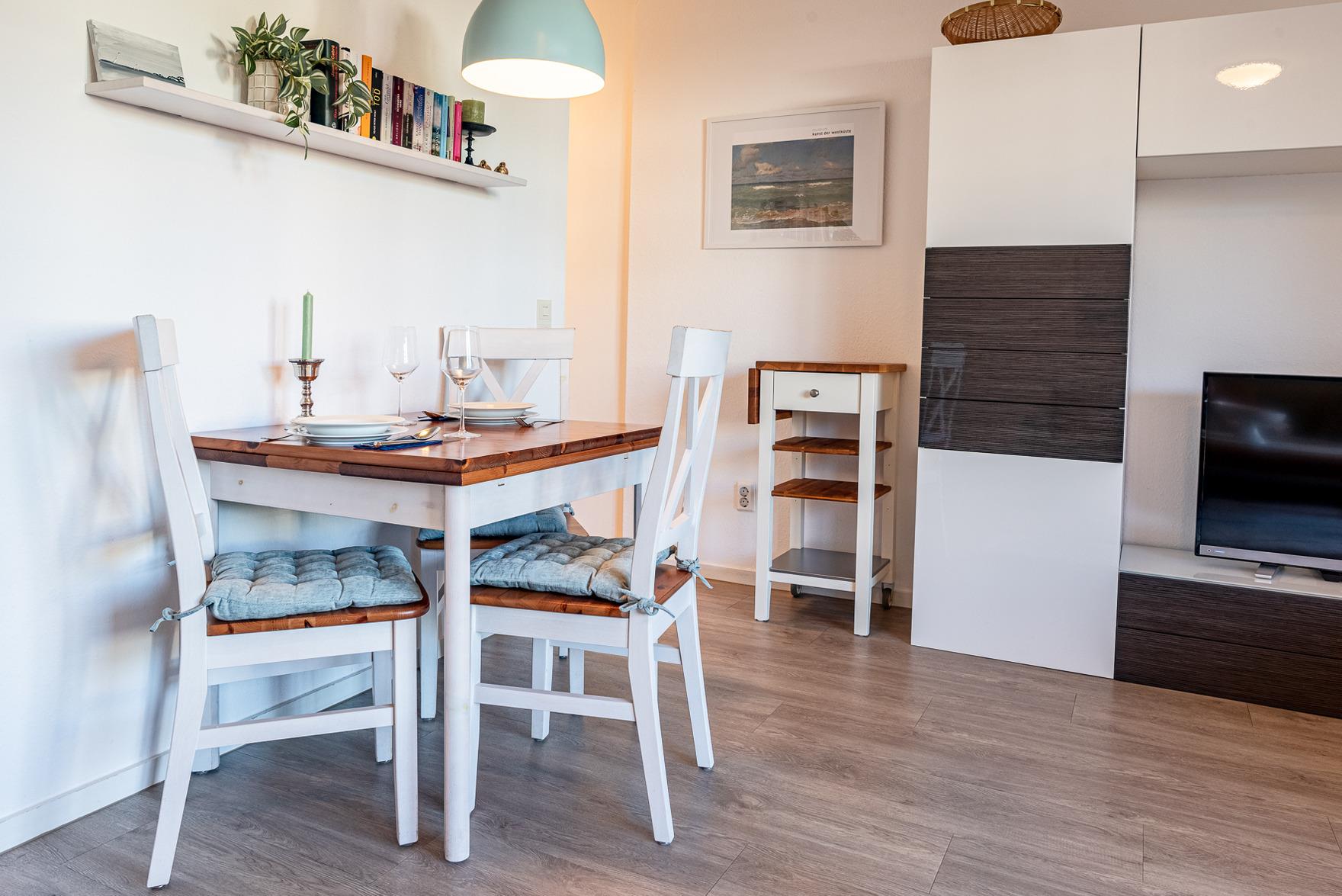 Die Wohnung verfügt über einen hellen Wohn- und Essbereich mit Zugang zur sonnigen Westterrasse. Hier finden Sie eine gemütliche Couch, ein Smart TV und eine offene Küchenzeile mit allen notwendigen Annehmlichkeiten vor. Zusätzlich gibt es ein Schlafzimmer mit einem Doppelbett (1,80m x 2,00m) und einem Kleiderschrank. Ein Badezimmer mit Dusche, WC und Handtuchheizung steht Ihnen ebenfalls zur Verfügung.