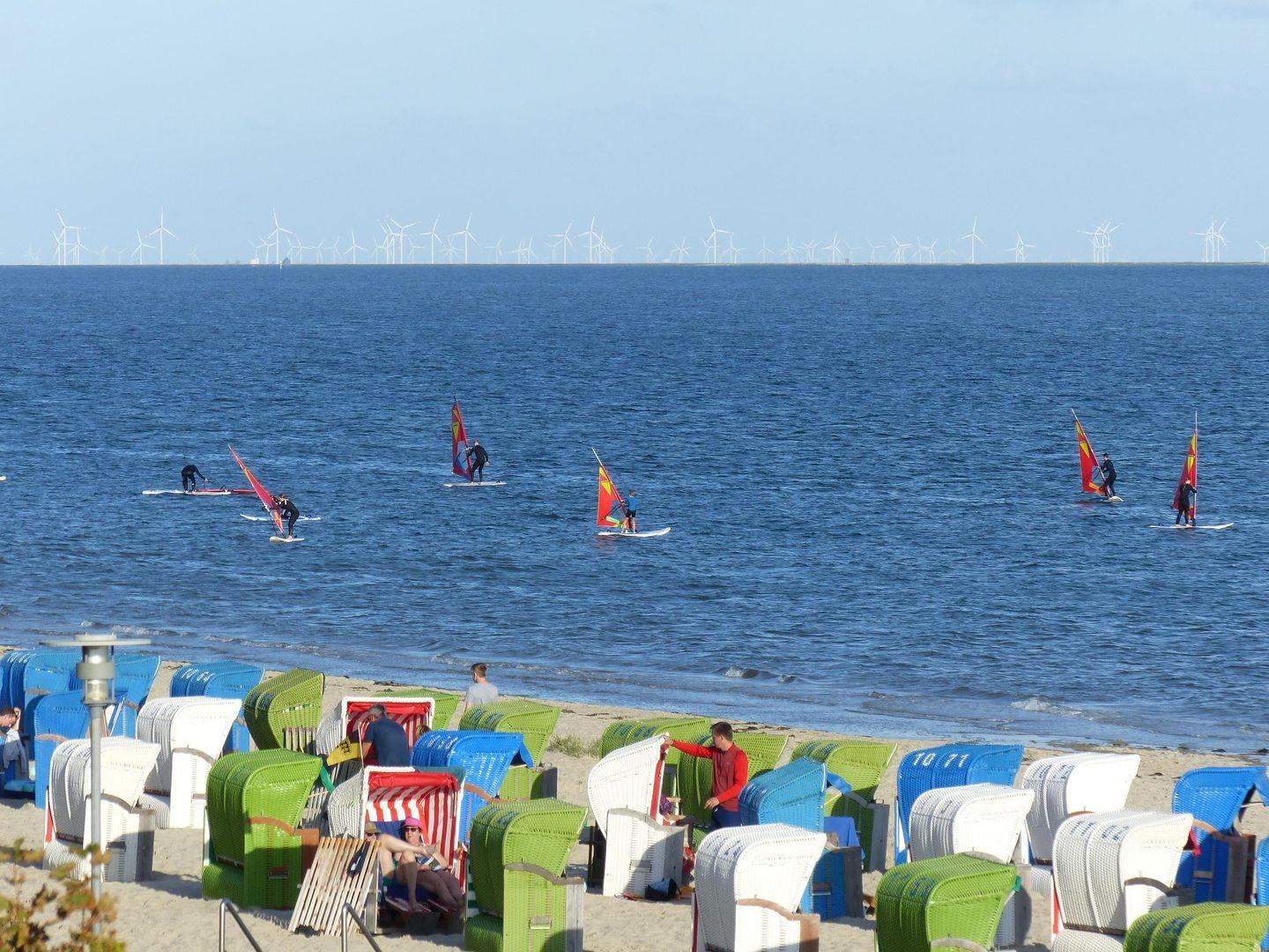 Der private, überdachte Balkon beziehungsweise die Terrasse ist mit Gartenmöbeln, Sonnenschirm und Zugang zum Garten mit Grillplatz und Gartenhaus ausgestattet. So lässt sich das nordfriesische Klima – unabhängig vom Wetter – ausgiebig genießen.