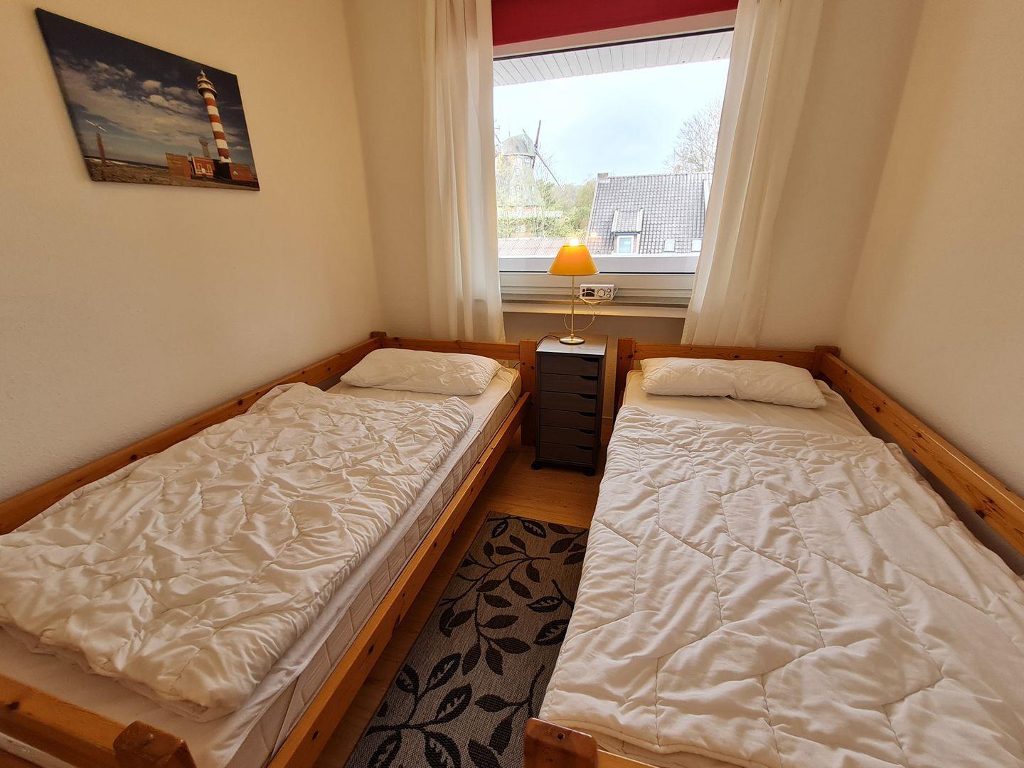 Die Wohnung besitzt neben dem Wohnraum mit Esstisch und angrenzender Einbauküche, zwei Schlafzimmer, Duschbad und Süd-West-Balkon mit Gartenmöbeln. Von allen Räumen aus haben Sie einen Blick auf die Wyker Mühle. Die moderne Küche verfügt über ein Ceran-Kochfeld, Geschirrspüler, Kühlschrank mit Gefrierfach, Wasserkocher, Toaster, Mikrowelle, Eierkocher, Mixer und natürlich alles was ein Koch benötigt. Die zwei Schlafzimmer mit einem Doppelbett (getrennte Matratzen je 90 x 200 cm) und zwei Einzelbetten (je 90 x 200 cm) sorgen für erholsame Nächte während Ihres Urlaubs. Das Tageslicht-Duschbad verfügt über eine Badewanne mit Glas-Duschwand. Die Ferienwohnung verfügt über einen SAT-TV, WLAN und eine Stereoanlage. Ein Tiefgaragenstellplatz gehört zur Wohnung (max. Höhe Ihres Autos darf 180 cm nicht überschreiten).