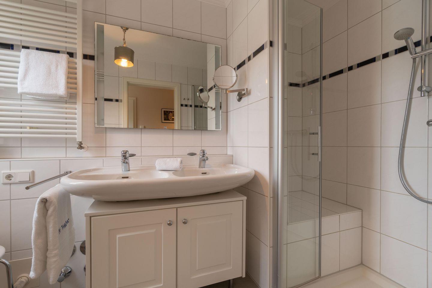 Die Ferienwohnung verfügt über einen Wohn- und Essbereich mit offener Küche, zwei Schlafzimmer sowie ein Bad mit bodengleicher Dusche. Die beiden Schlafzimmer sind ruhig seitlich des Hauses gelegen. Im ersten Schlafzimmer steht Ihnen ein Doppelbett zur Verfügung, im zweiten Schlafzimmer zwei Einzelbetten und ein eigener Fernseher.