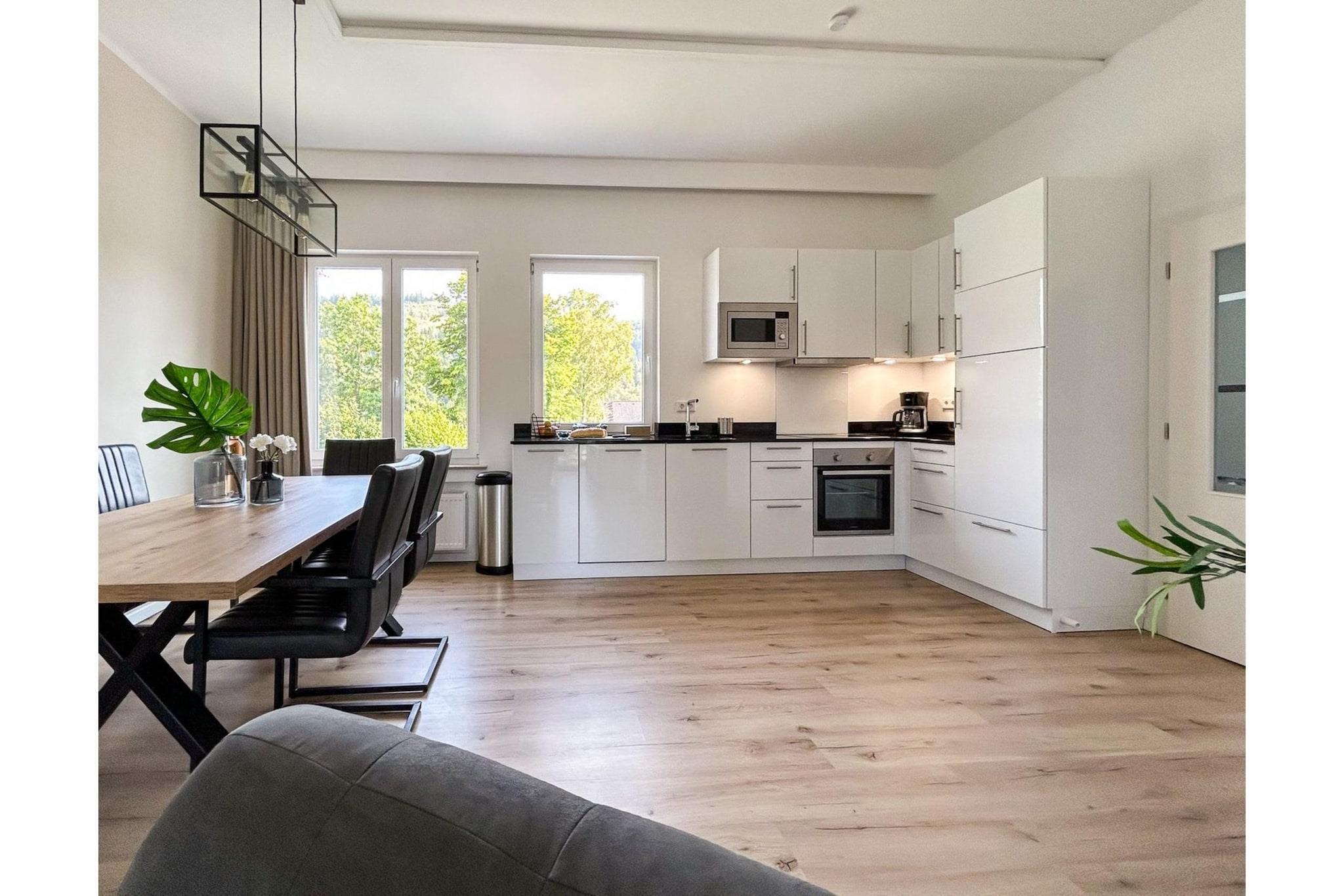 Enjoy your holiday in this modern holiday apartment in the idyllic mountain village of Züschen, just 5 km from the popular Winterberg ski resort. The spacious accommodation offers two bright bedrooms with comfortable box-spring beds, a stylish bathroom, and a cozy living/dining room with a smart TV and access to a balcony with stunning panoramic views. The open, fully equipped kitchen with a ceramic hob, oven, refrigerator with freezer, Nespresso and filter coffee machines invites you to spend convivial evenings. Another highlight is the large balcony with a seating area, sun loungers, and a parasol – perfect for enjoying the nature and tranquility of the Sauerland region. A crib, highchair, and washing machine are available for families. Parking is included at the house. The location is ideal: In summer, you can reach Lake Hillebach in just a few minutes for swimming, hiking, or water sports; in winter, the ski slopes, lifts, and après-ski await you in Winterberg. Hikers, mountain bikers, and e-bikers will find fantastic routes year-round.