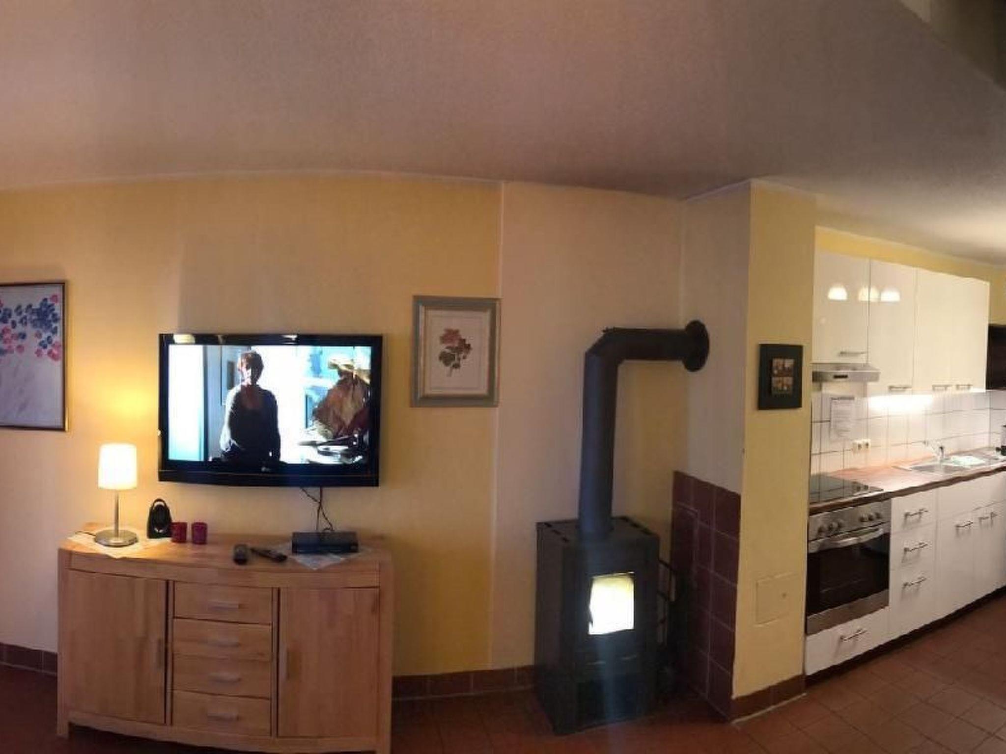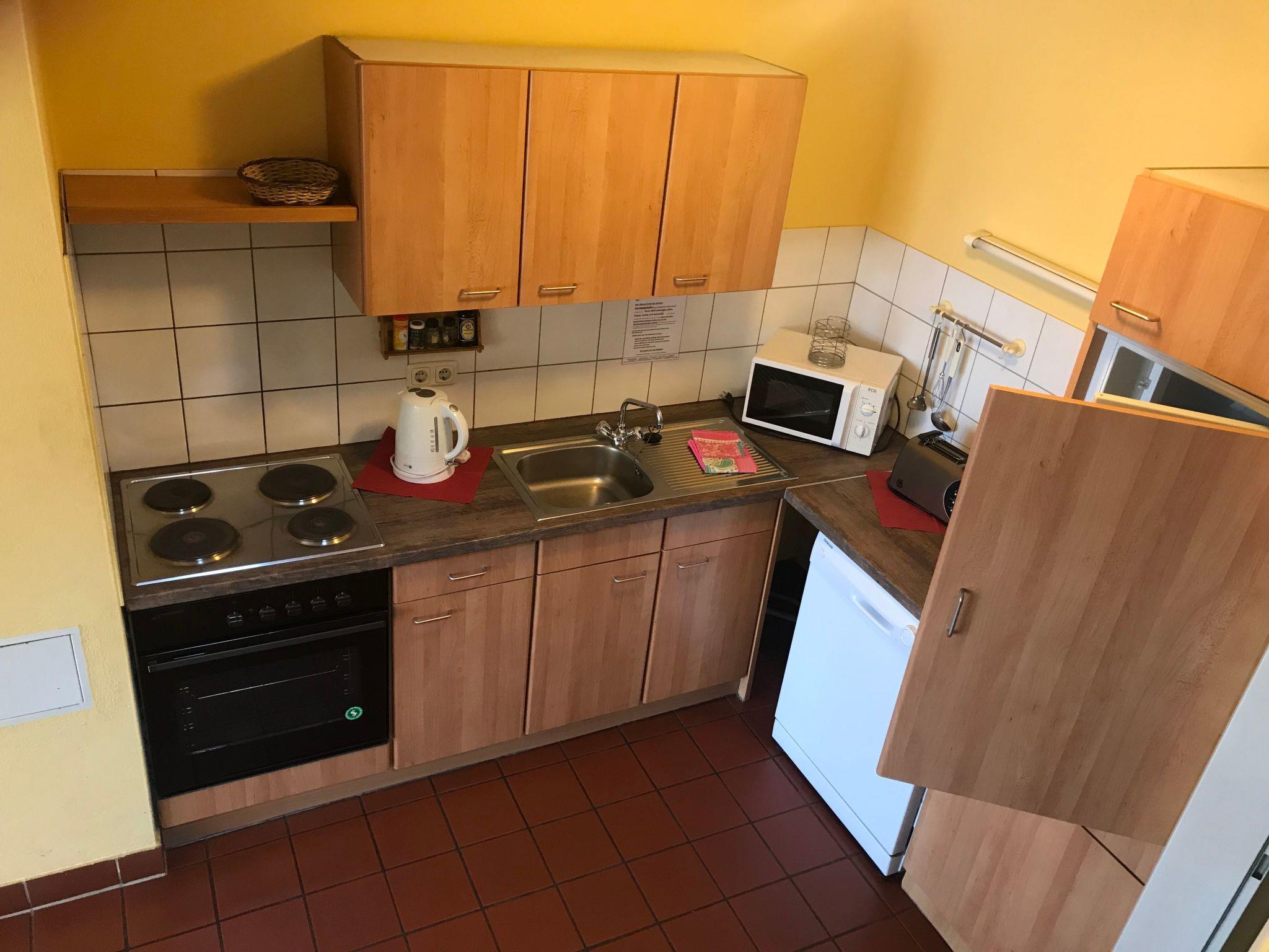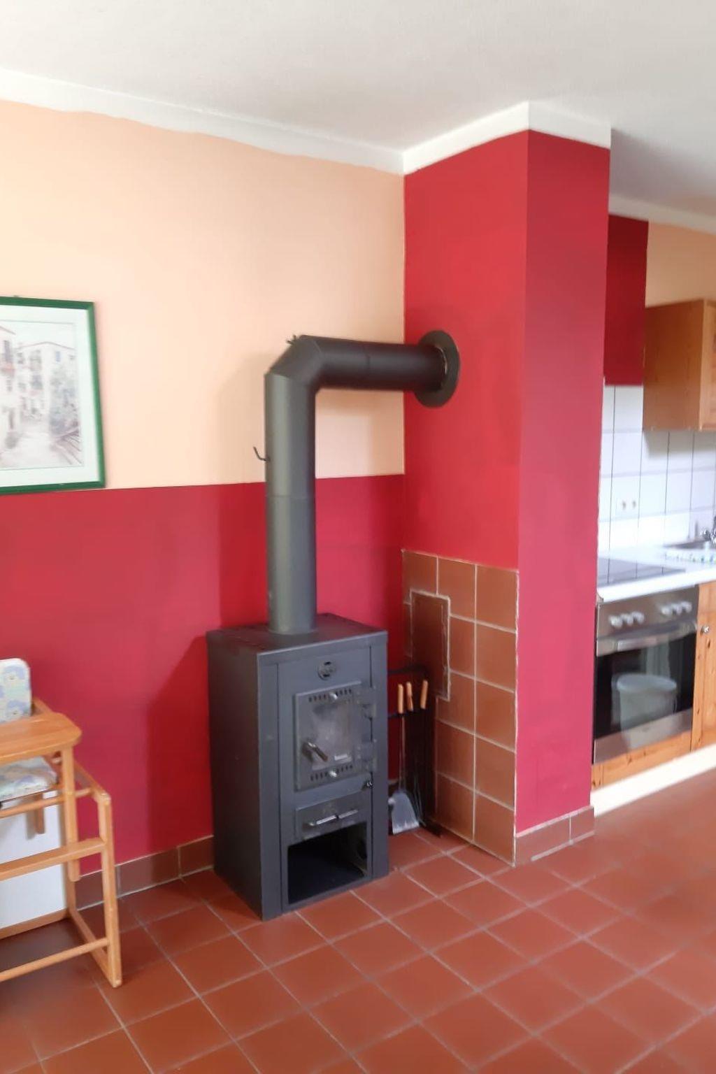 Cosy holiday home with three toilets, equipped kitchen, small terrace with garden area, can also be fenced in for our four-legged guests, two separate bedrooms, own parking space, small wood-burning stove