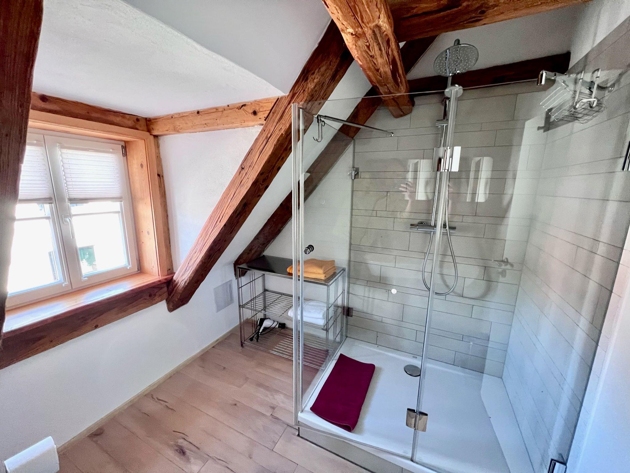 Die Wohnung teilt sich auf in zwei gegenüberliegende Schlafzimmer in ein gemütliches Wohn-Esszimmer mit integrierter Küche und einem in das alte Gemäuer eingegossene Bad.