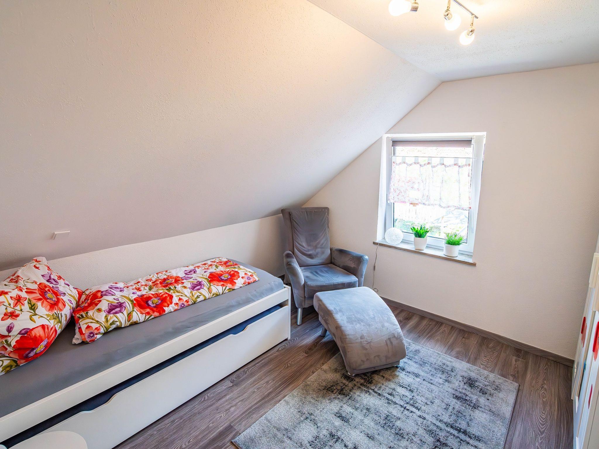 Und einmal ein Einzelbett unter dem sich eine weitere Matratze zum Ausziehen befindet. Beide Zimmer verfügen über Kleiderschränke mit Bügeln und einer Sitzgelegenheit, sowie Nachtlichtern und einem Wecker.