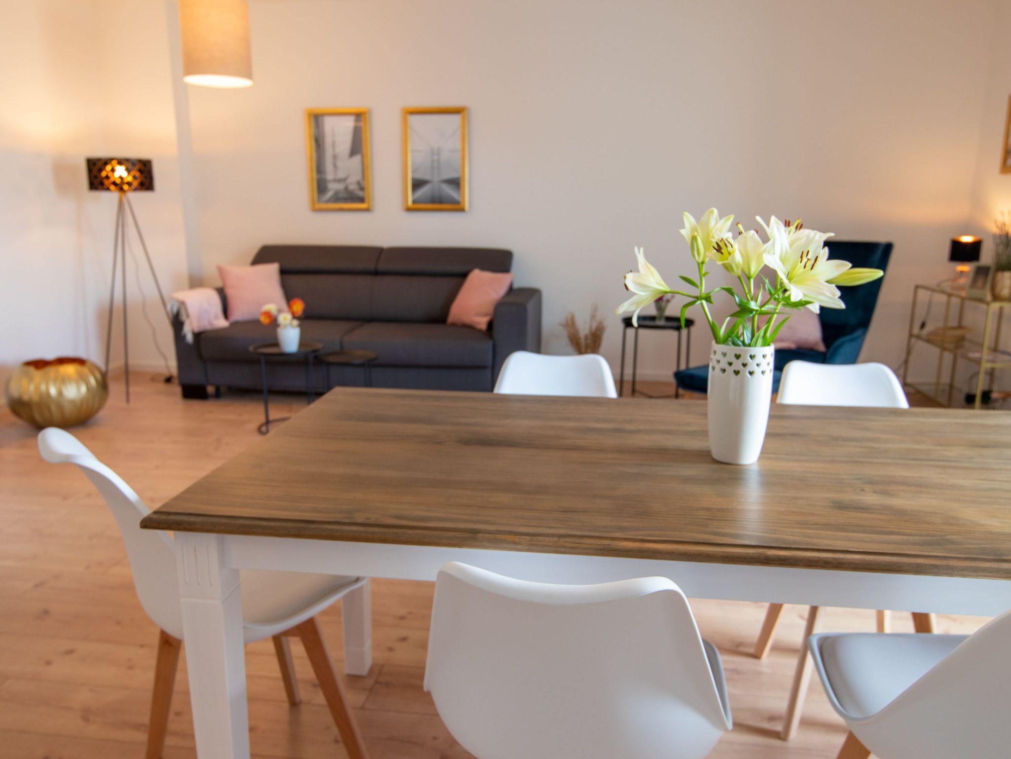 Die Ferienwohnung Wiesenglück im Erdgeschoss des Landhaus Wiesenblick in Zarrendorf ist für bis zu 8 Personen geeignet. Sie verfügt auf 100m² Fläche über 1 Wohnbereich mit offener Küche und Essbereich, sowie einer Schlafcouch die zu einem vollwertigen Bett (160x200) umgebaut werden kann. Die drei separaten Schlafzimmer beinhalten jeweils ein Doppelbett (160x200) und eine Garderobe. Die beiden Badezimmer sind abschließbar und mit einer ebenerdigen Dusche, Waschbecken und WC ausgestattet. Ein Badezimmer verfügt des Weiteren über eine Badewanne und Waschmaschine. Die Küche enthält neben einer Spüle, Geschirrspüler, Backofen, Cerankochfeld, Kühlschrank mit Gefrierfach, Wasserkocher, Toaster, Kaffeemaschine auch Küchenhelfer, Besteck und Geschirr. Vor dem Eingang befindet sich eine separate Terrasse für die Gäste der Ferienwohnung Wiesenglück. Die große Terrasse mit Lounge Möblen steht zur gemeinschaftlichen Nutzung und zum Grillen zur Verfügung.
