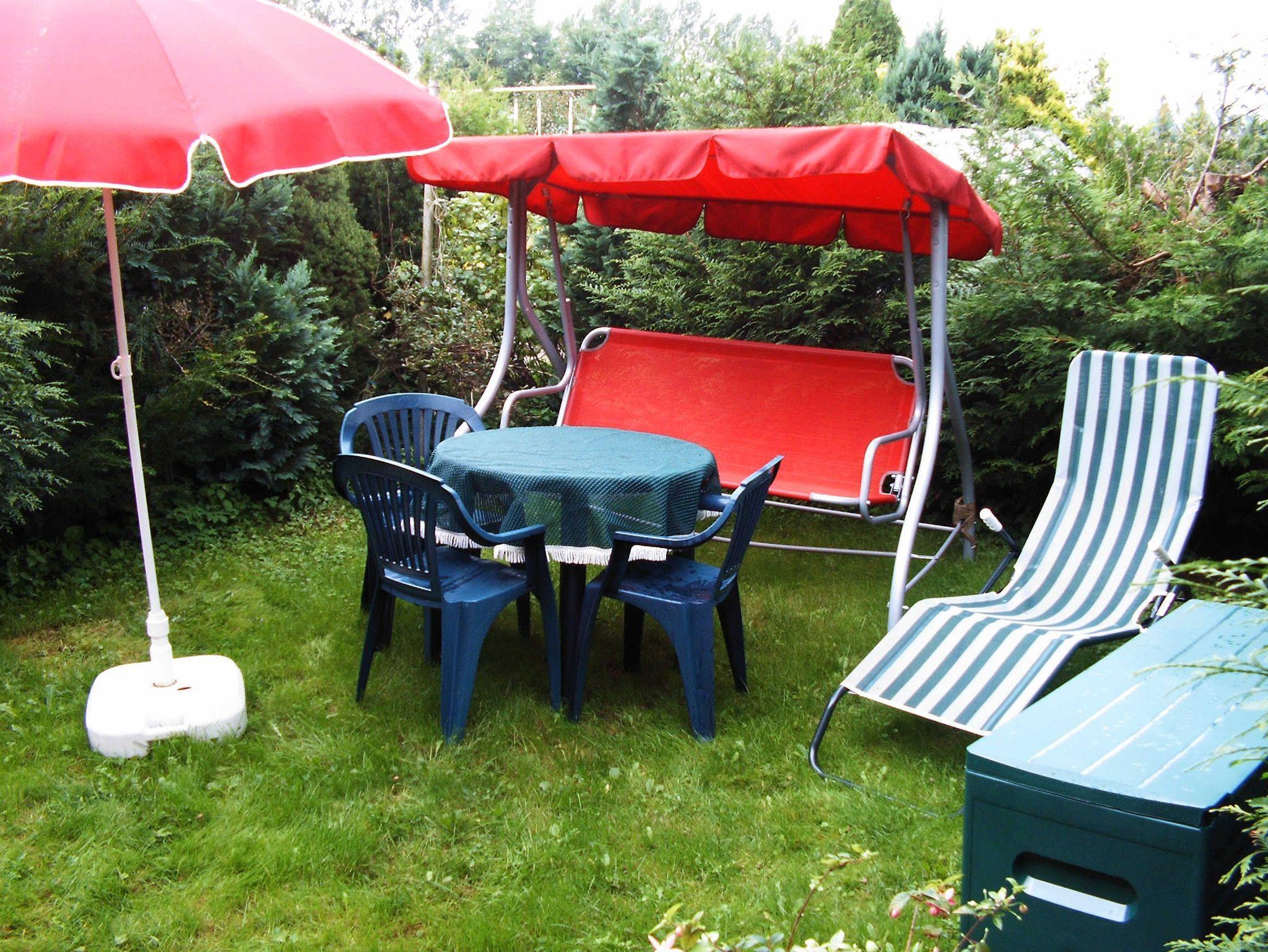 Auf dem Grundstück gibt es einen Parkplatz für das Auto und im Garten eine Terrasse mit Gartenmöbeln.