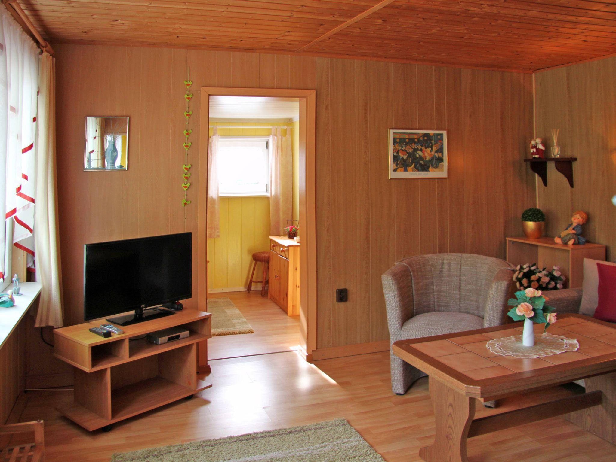 In der kleineren Ferienwohnung befinden sich auf 40 m² ein gemütliches Wohnzimmer mit Sitzecke und Sat-TV, Doppelbett-Schlafzimmer, voll ausgestattetem Küchenbereich und Dusche/WC.
