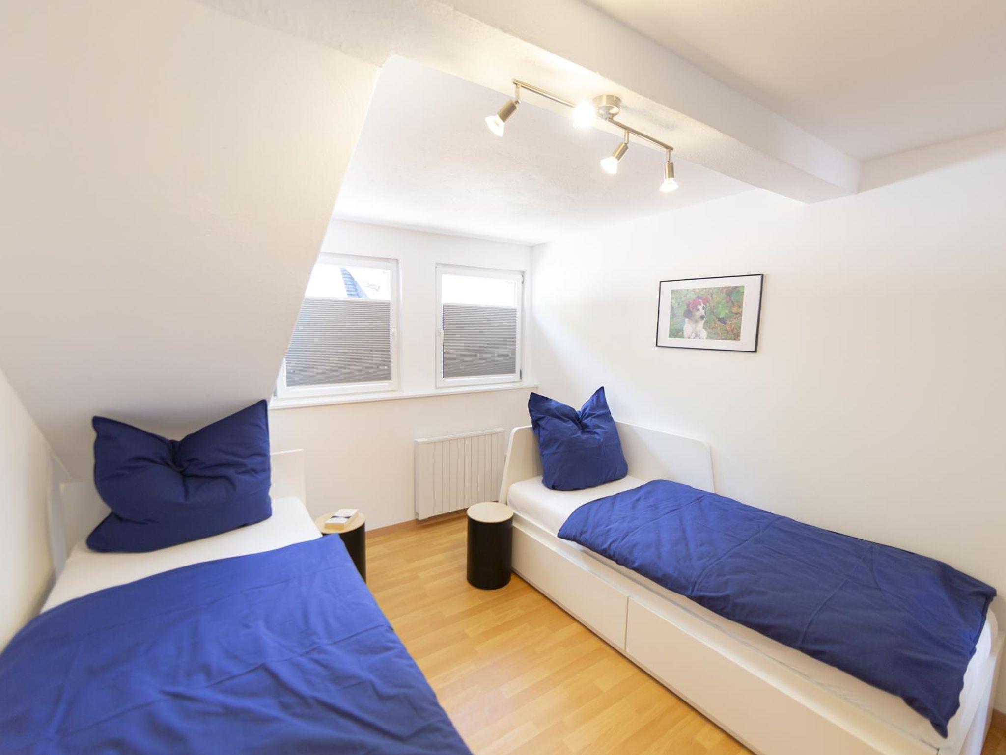 Geruhsame Nächte verbringen Sie in einem der drei Schlafzimmer. An den Master Bedroom mit einem Doppelbett (1,80 x 2,00 m) und Spiegelschrank schließt sich ein Duschbad an. Dieses Schlafzimmer hat auch Außenrollläden. In dem größeren Schlafzimmer im Dachgeschoss befinden sich zwei Betten mit 1,40 m und 0,9 m Breite. Das kleinere Schlafzimmer ist mit zwei Einzelschlafplätzen ausgestattet. Ein Babyreisebett ist vorhanden. Ausreichend Stauraum für die Urlaubsgarderobe ist vorhanden.