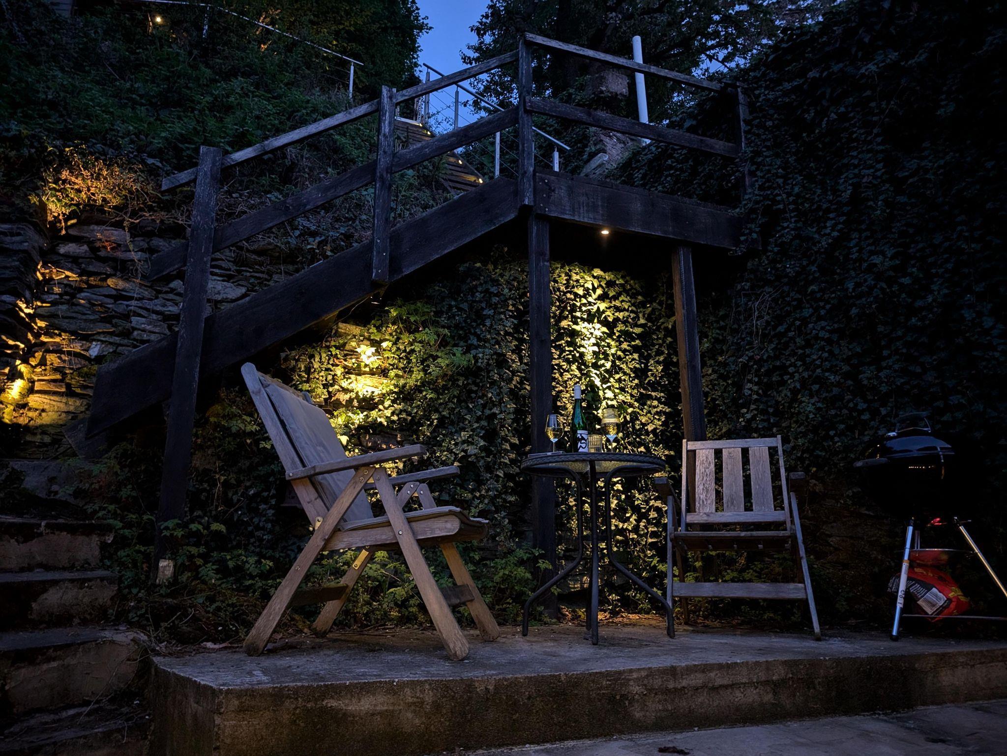Der Garten bietet 3 Terrassen- Eine direkt am Haus, eine weitere etwas erhöht und eine mit traumhaftem Blick über die Dächer von Zell und die Mosel. Aber Achtung! Hier sind Trittsicherheit und Schwindelfreiheit gefragt. Wer den Aufstieg auf sich nimmt, findet hier den perfekten Platz um den Abend mit einem Glas Riesling ausklingen zu lassen.