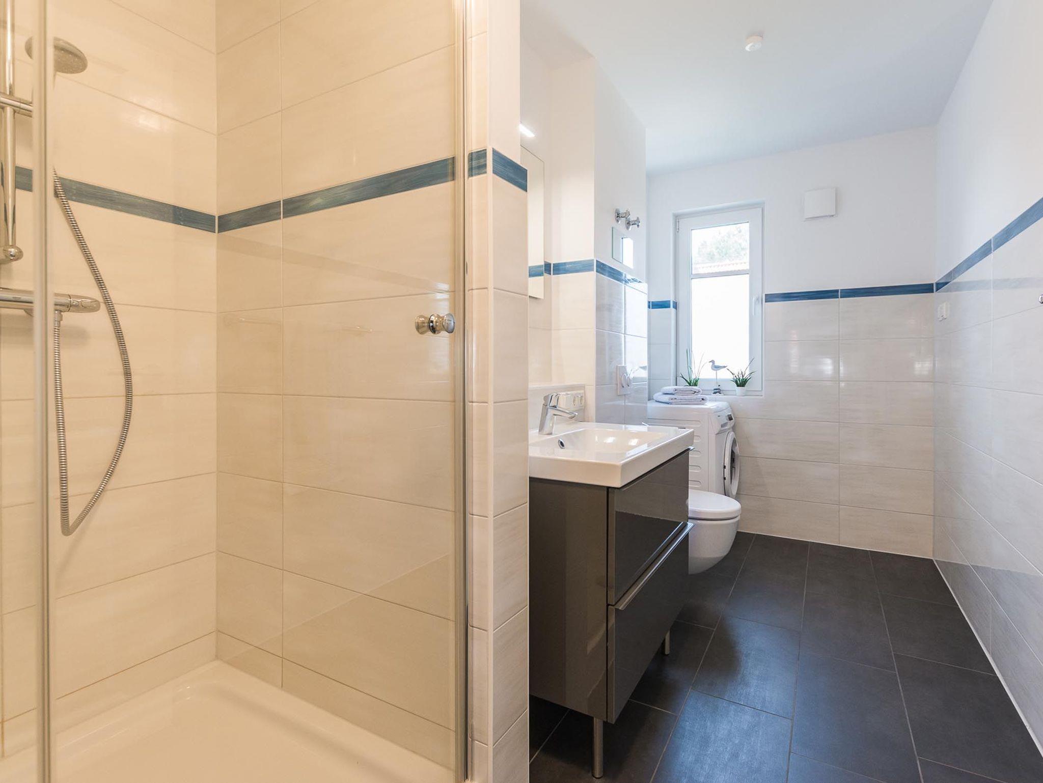 Das modern eingerichtete Badezimmer ist mit einer hochwertigen Dusche sowie einer Waschmaschine ausgestattet.