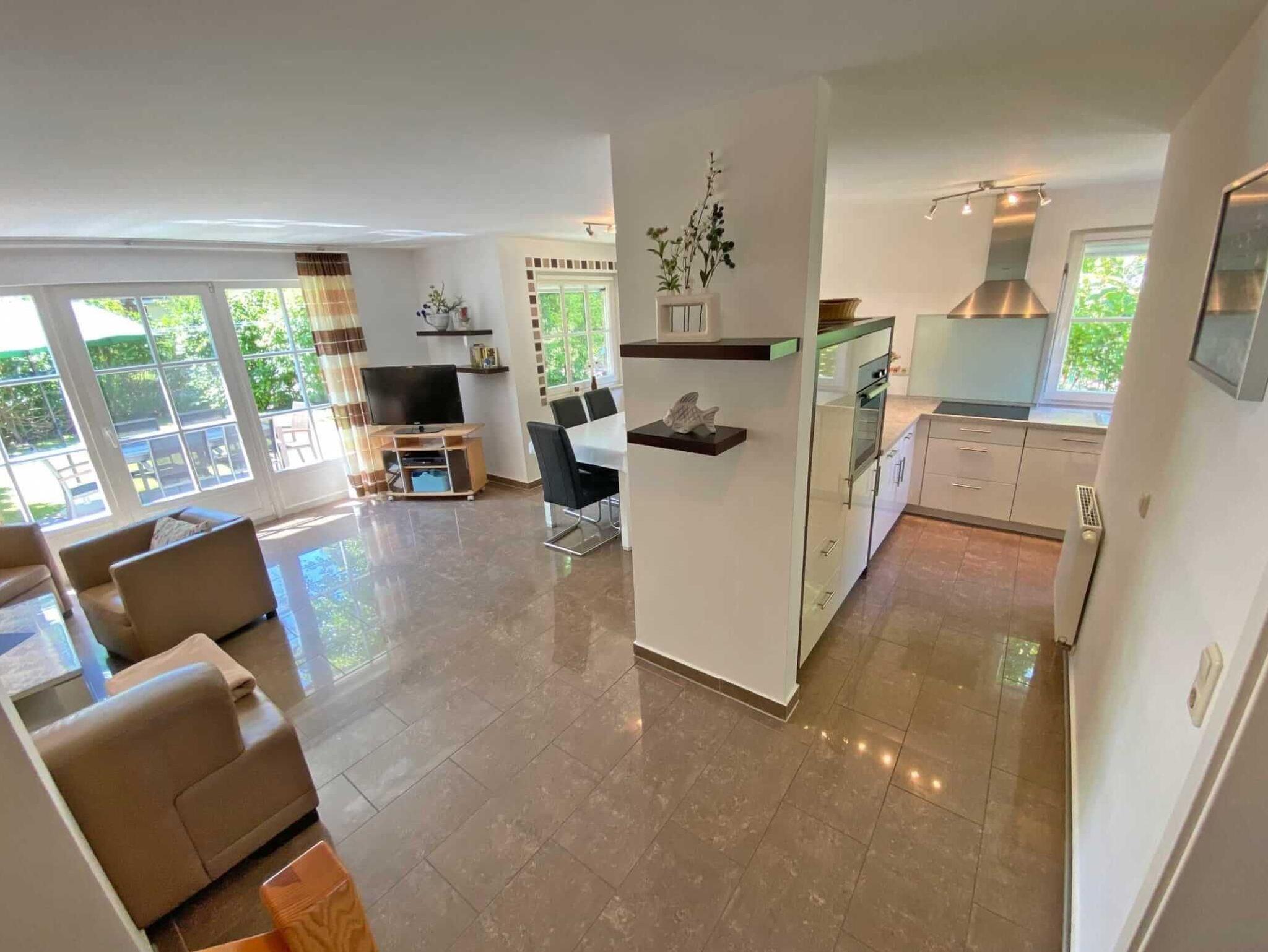 Hier verbringen Familien, Paare und Hundebesitzer entspannte Urlaubstage mit viel Freiraum und angenehmem Komfort. Der helle Wohnbereich mit gemütlicher Sofaecke und großem Essplatz bildet das Herzstück des Hauses. Die gut ausgestattete Küche ermöglicht eine unkomplizierte Selbstversorgung auch für größere Familien.