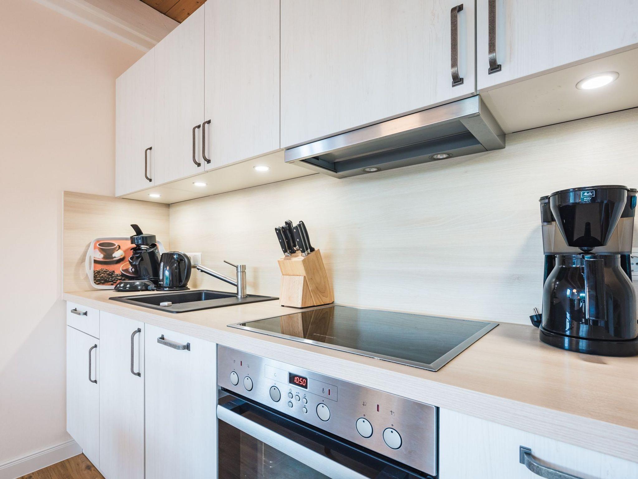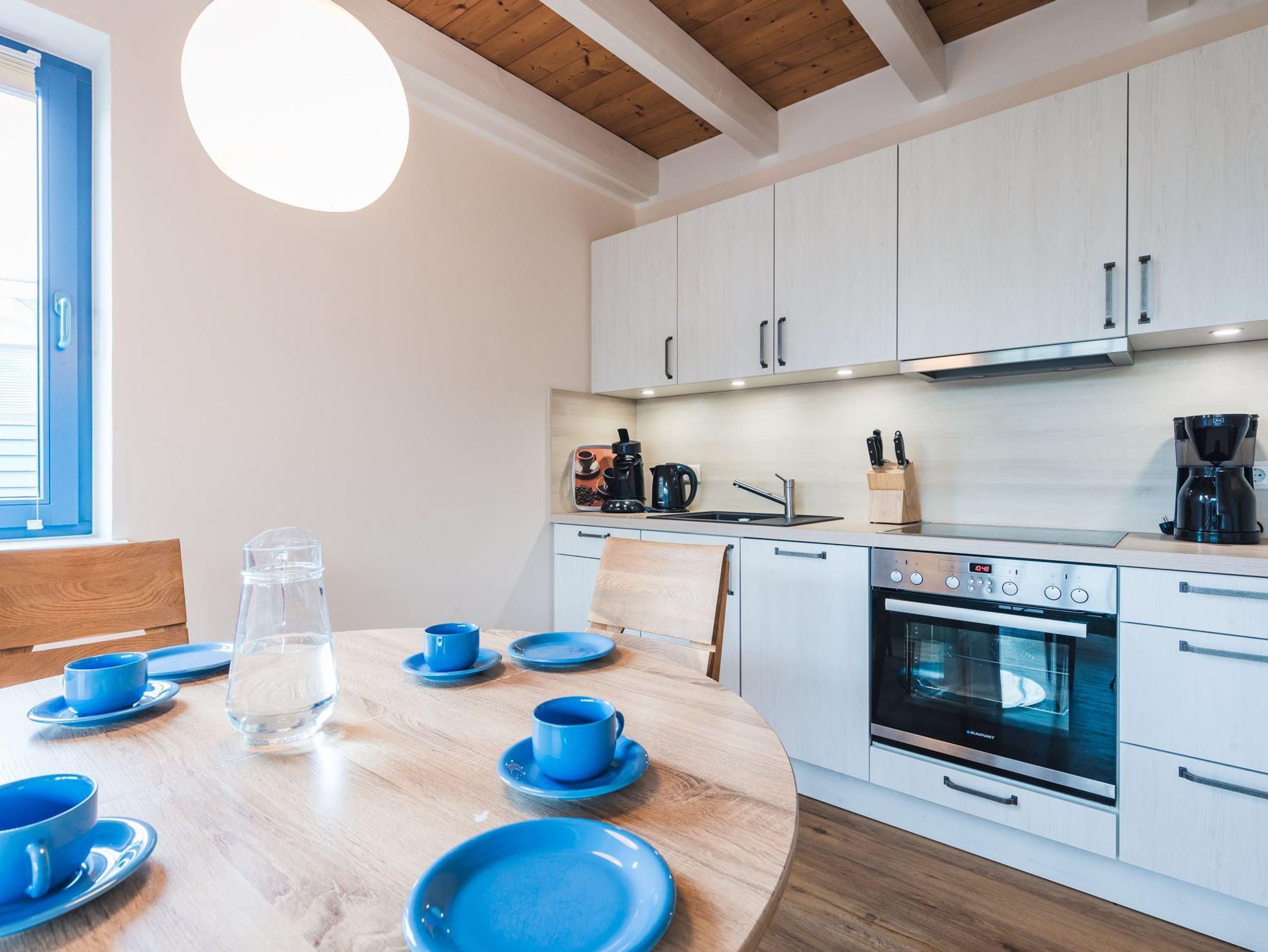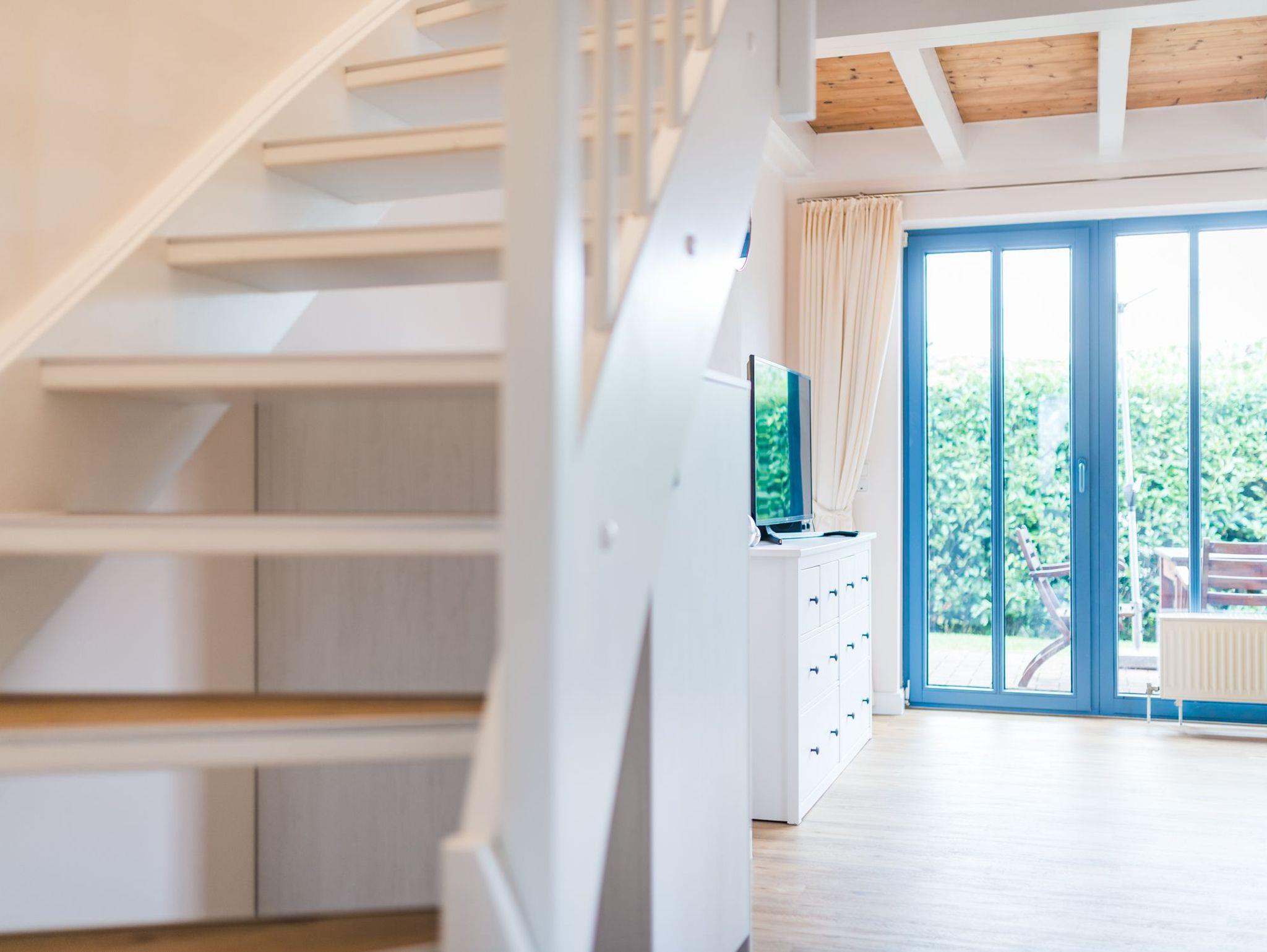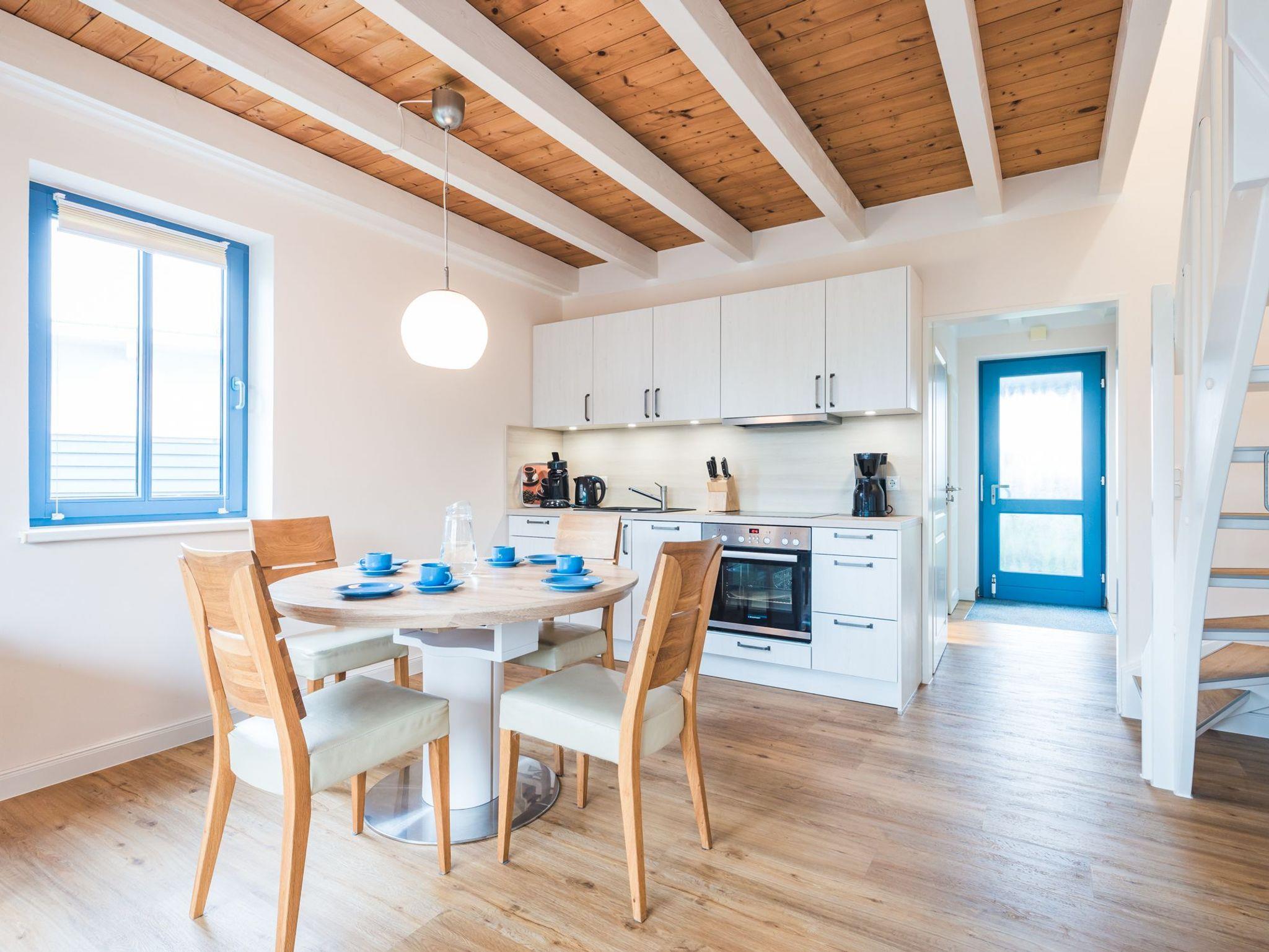 Im Erdgeschoss befindet sich ein lichtdurchfluteter Wohnbereich mit einer offenen Küche und gemütlichem Essbereich. Die Küche ist voll ausgestattet.