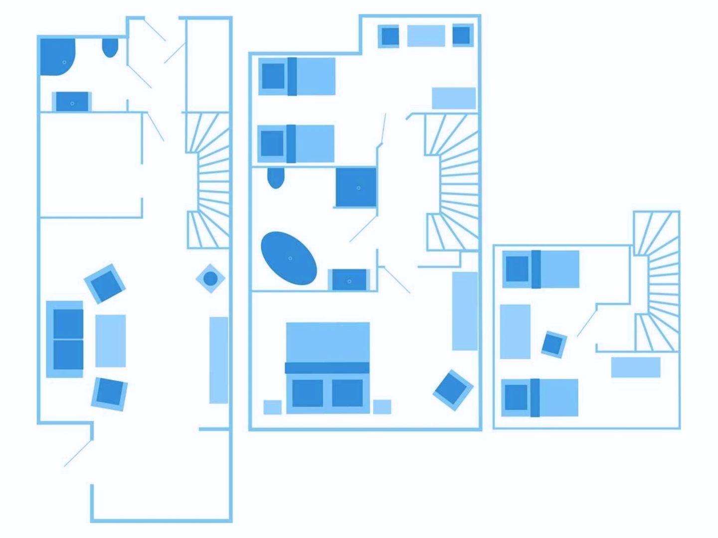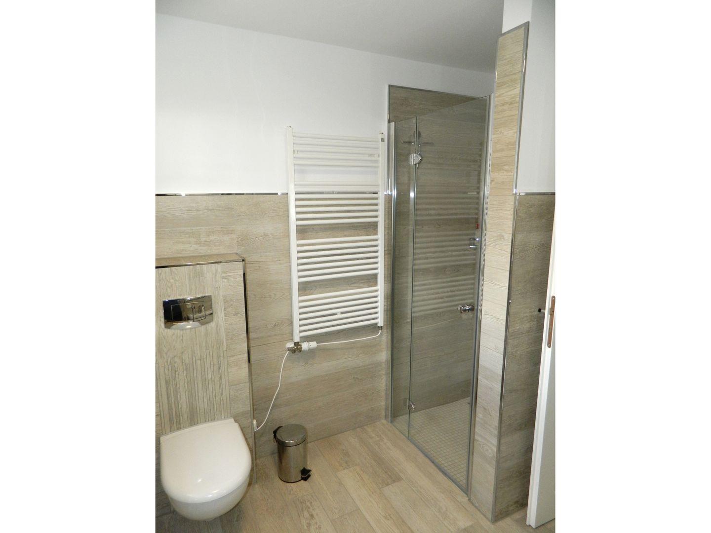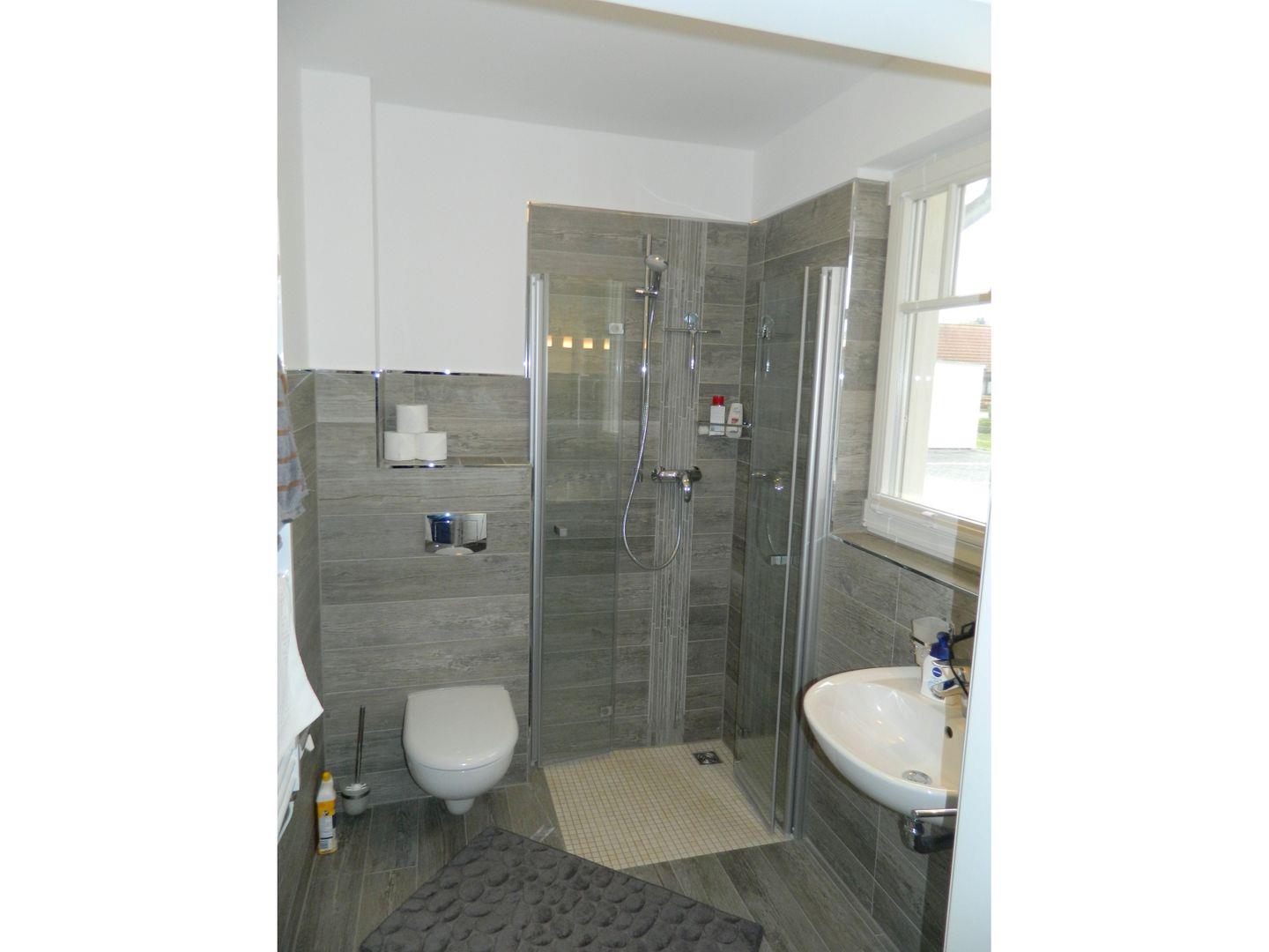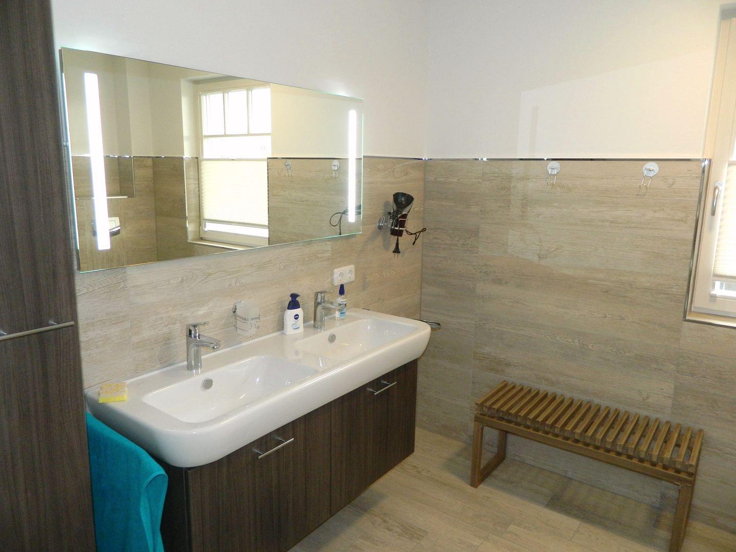 Im Ersten Obergeschoss sind die beiden Schlafzimmer mit Doppelbett und zwei Einzelbetten, sowie ein weiteres Bad mit Dusche.