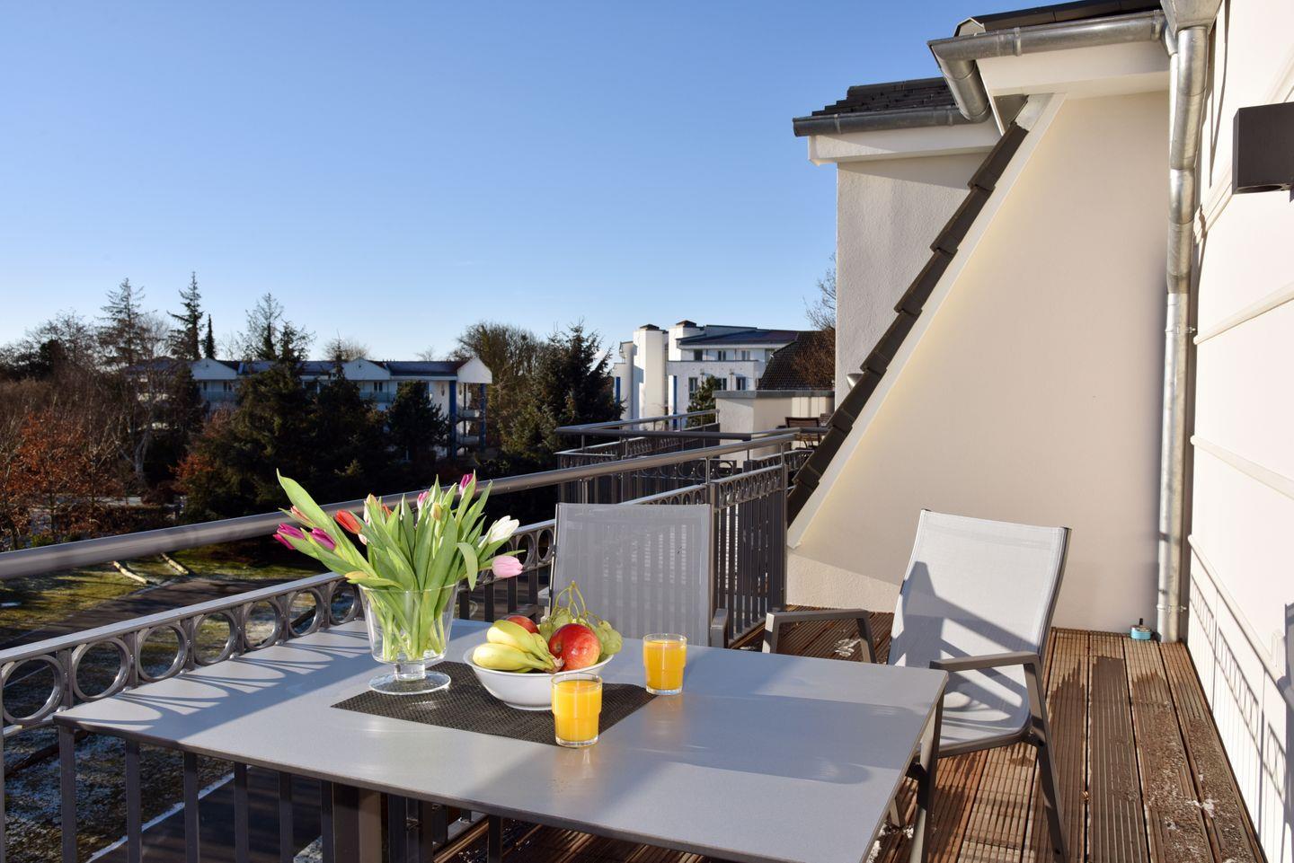 Ein möblierter, sonniger Südbalkon lädt zum Verweilen ein.